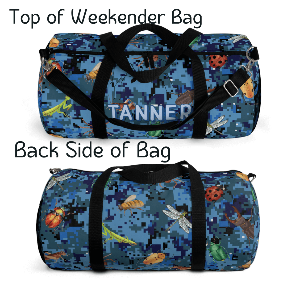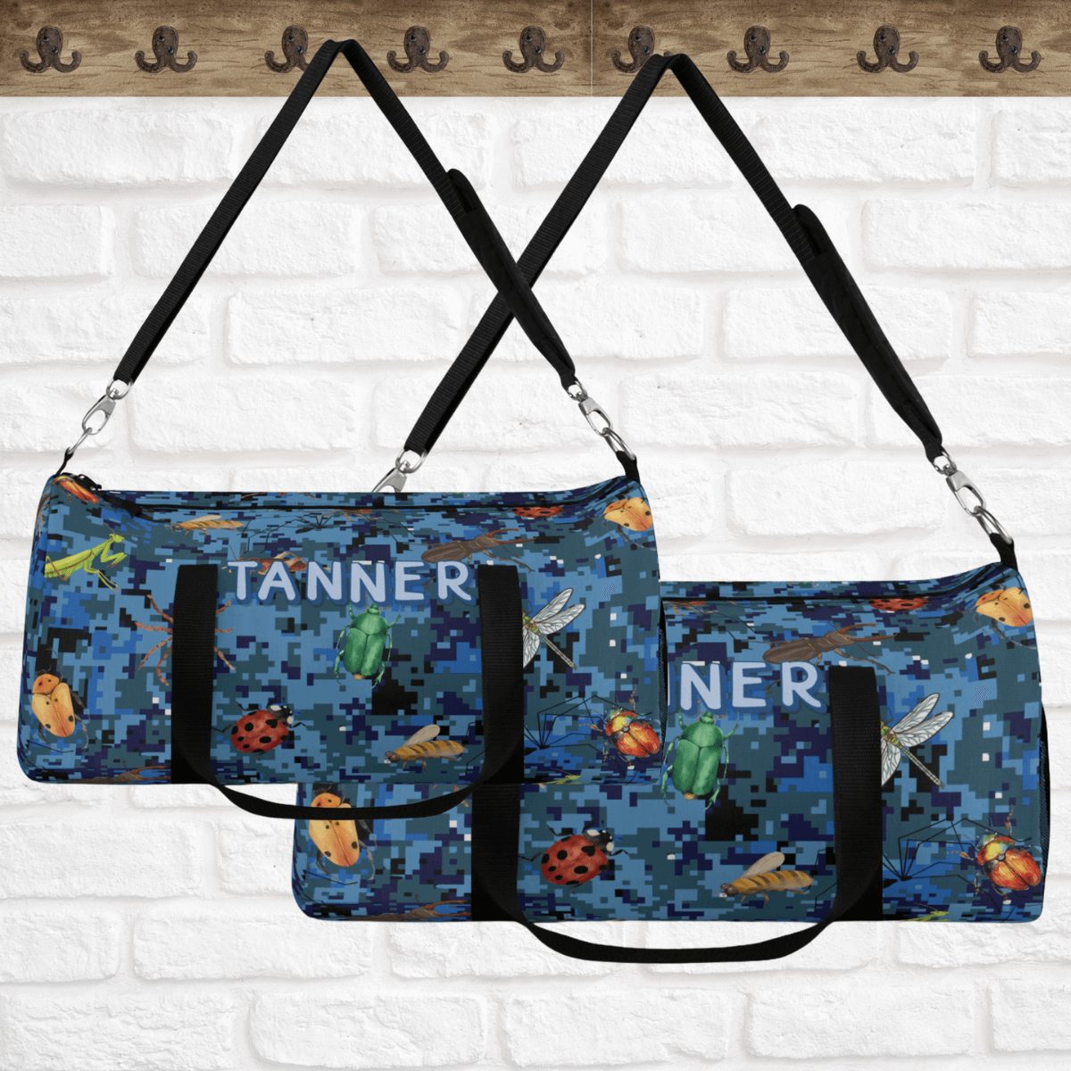 Boys Camo Overnight Bag with Bugs, Blue Camo Duffel Bag