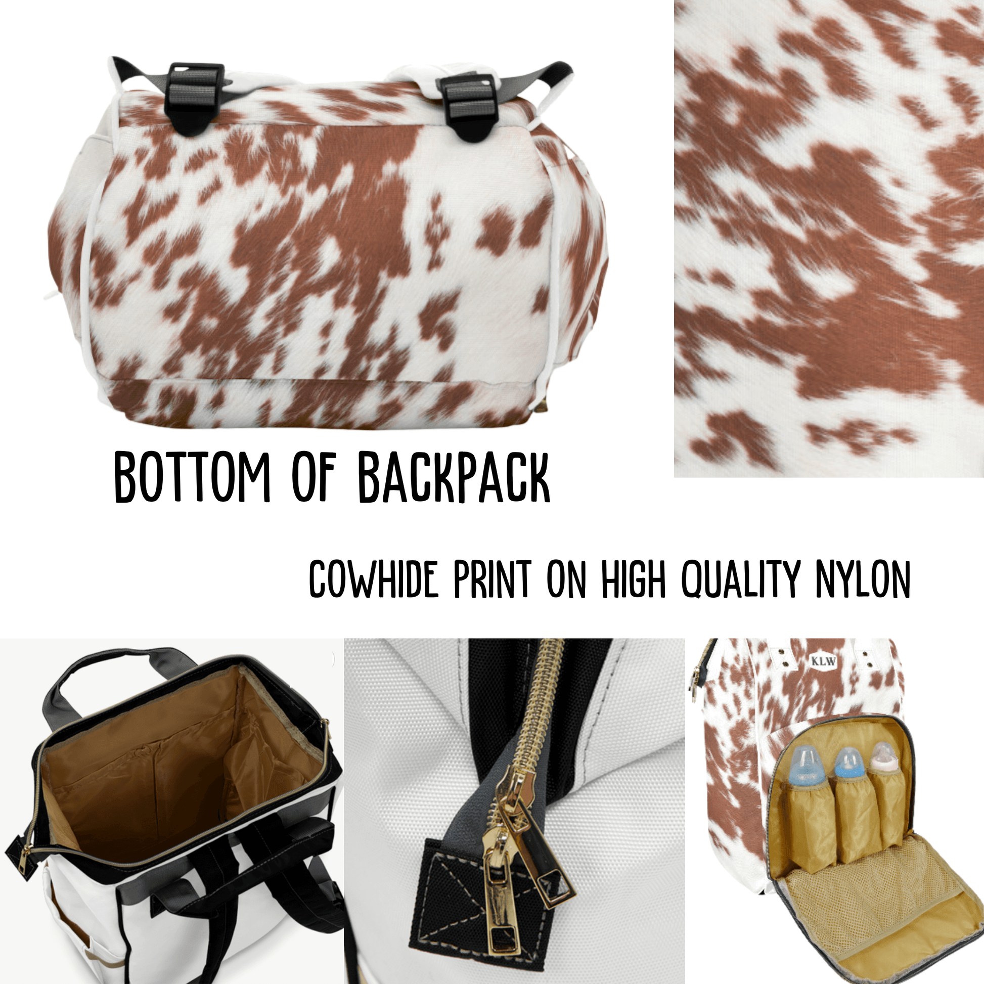Our cow print diaper bag doubles as a custom Western backpack for women and can be personalized for the ultimate gift for girls or traveling women.