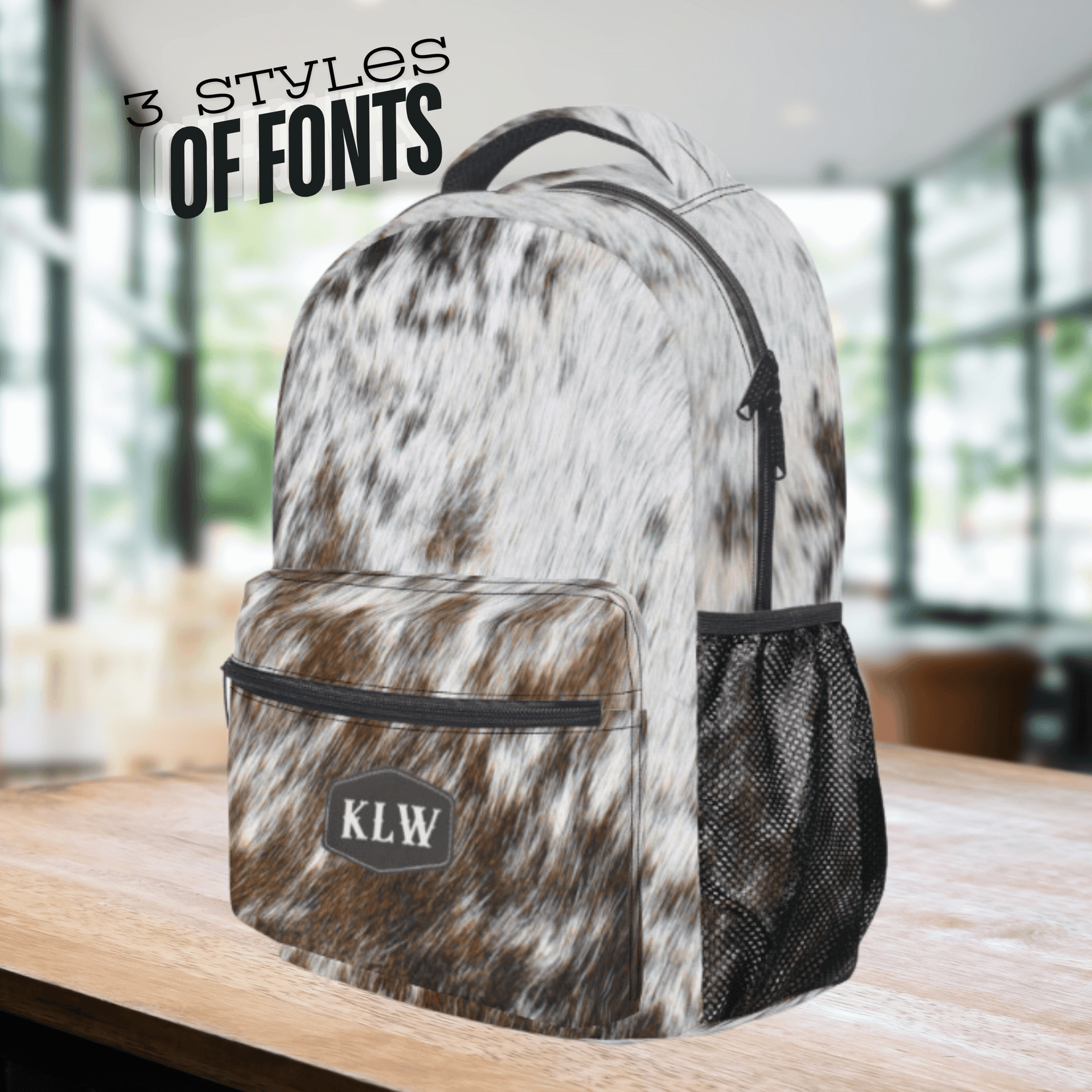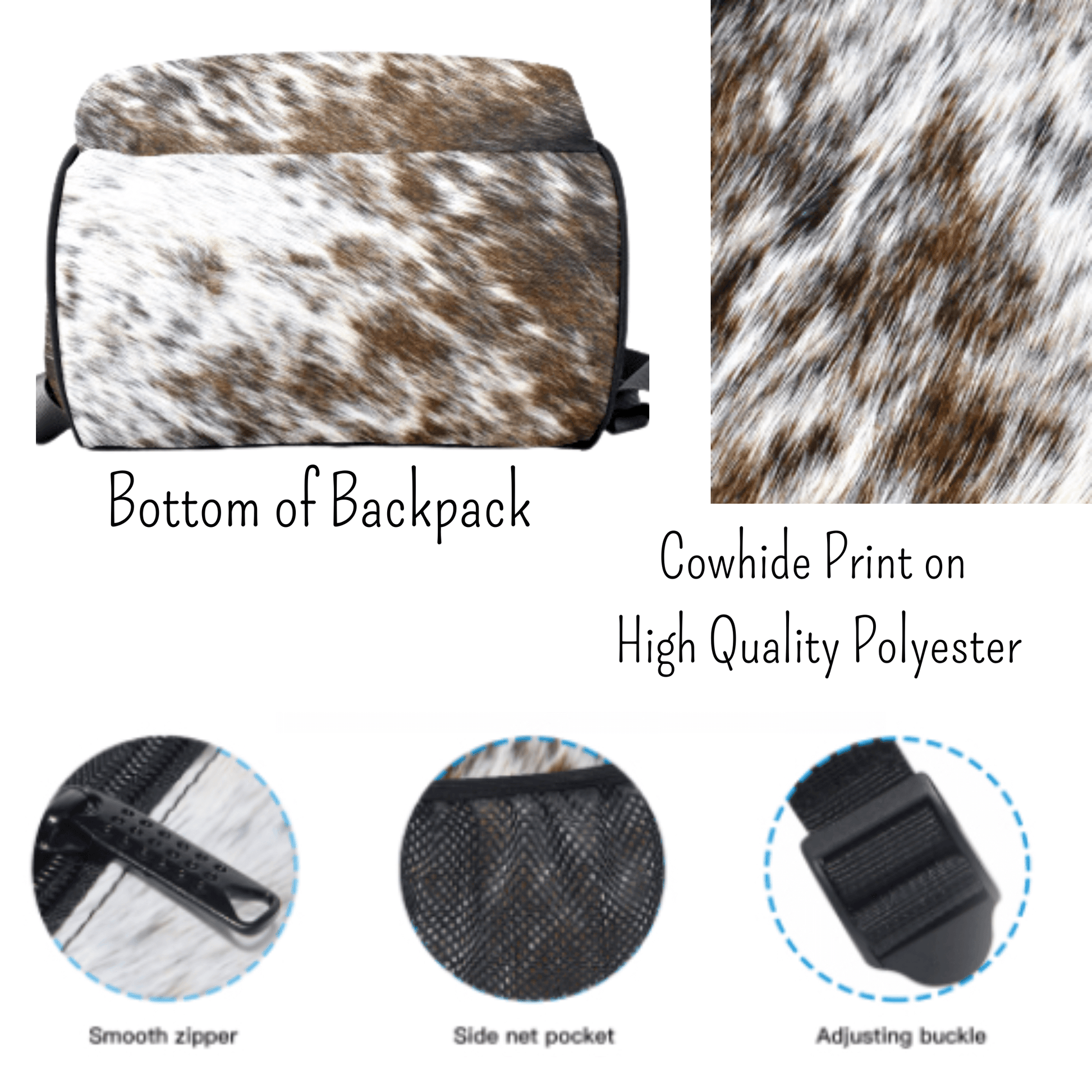 A cowhide backpack personalized with name that's washable! This durable backpack for her is the perfect size for holding all your stuff! Perfect for the student backpack or can double for a purse or diaper bag.