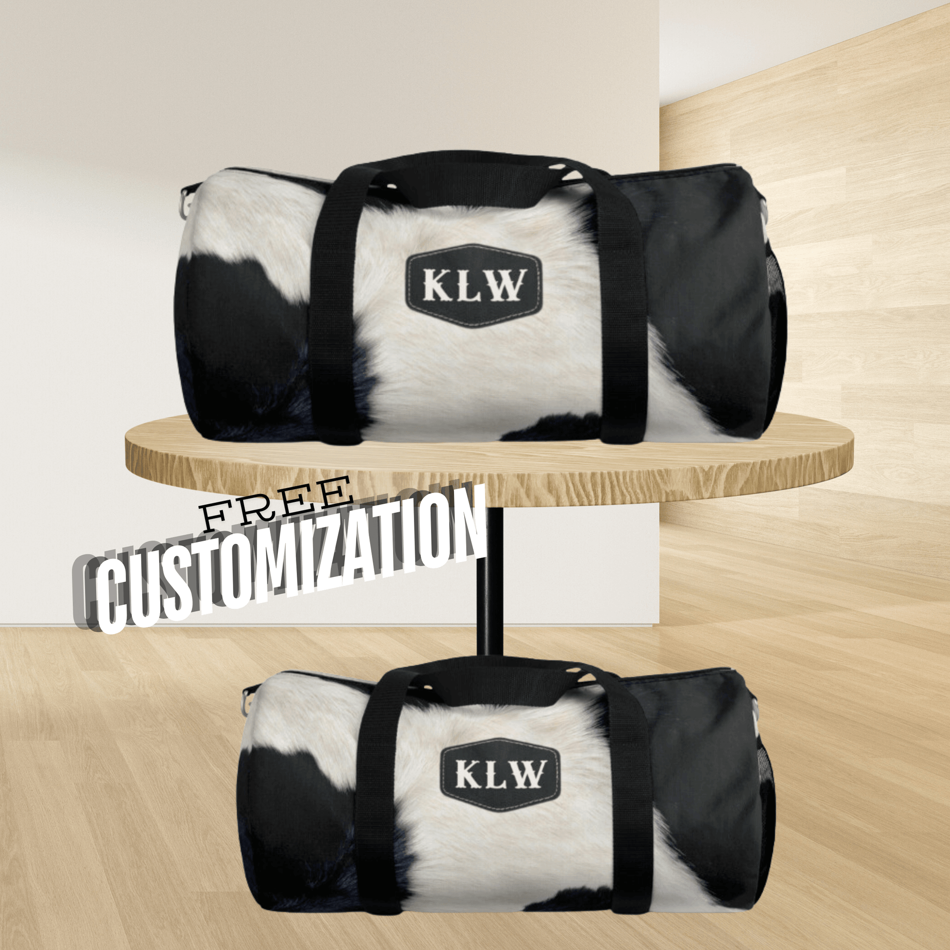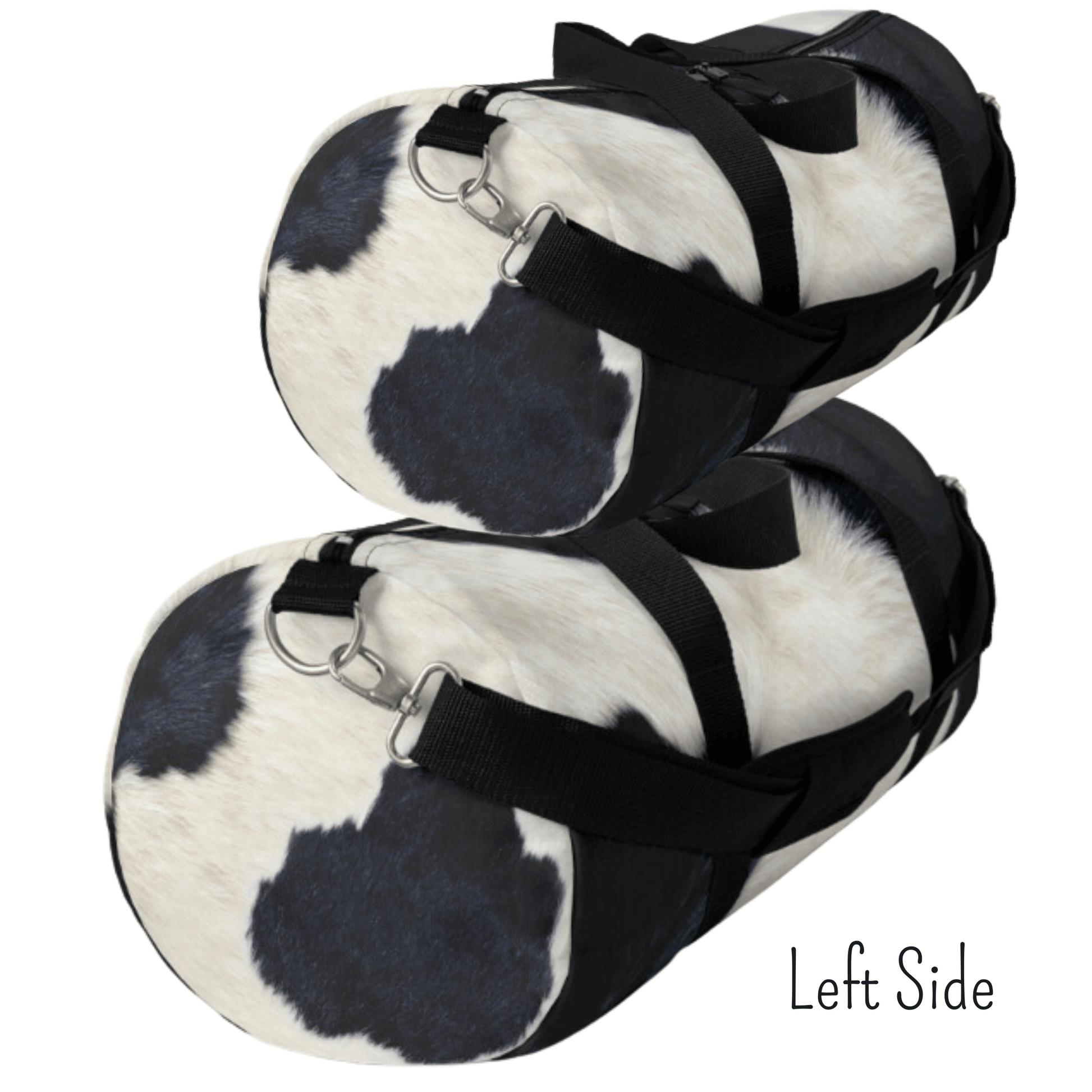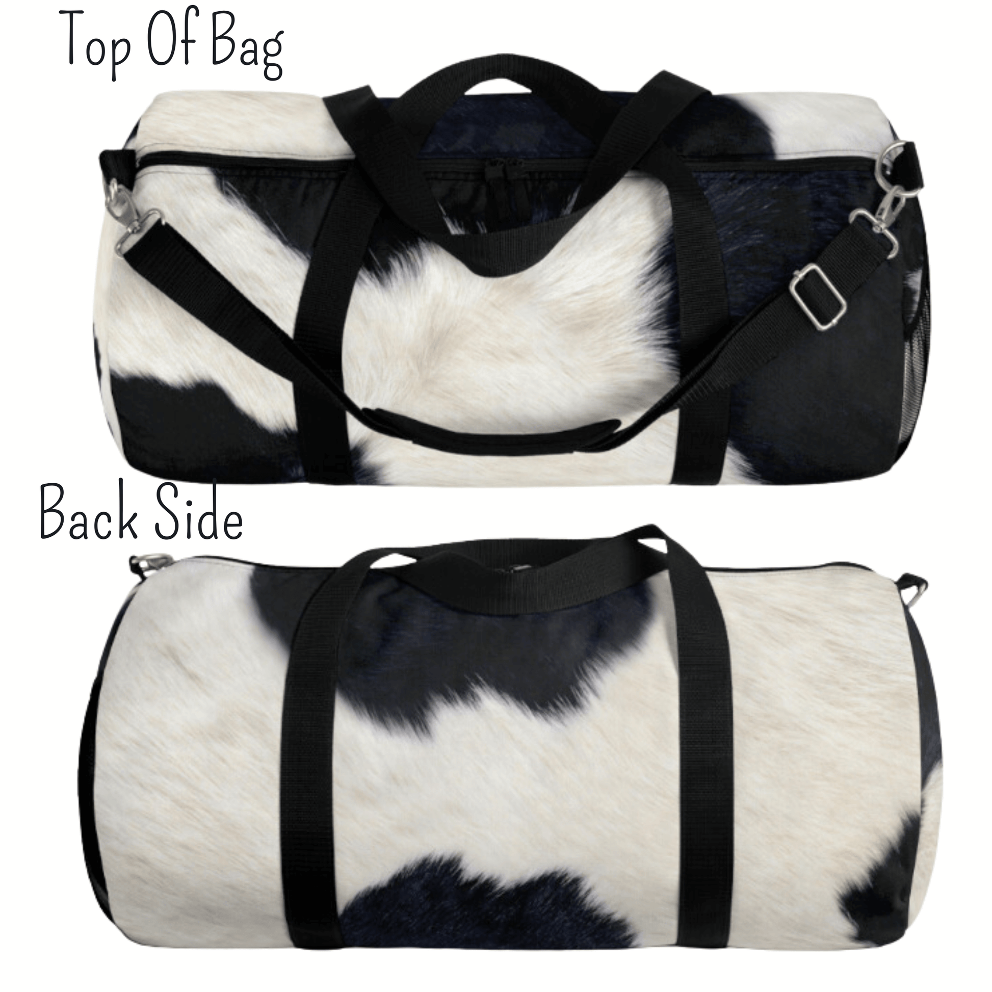 The perfect cowhide print gym bag for girls doubles as a custom sports bag for school or a monogram cow print weekender bag.