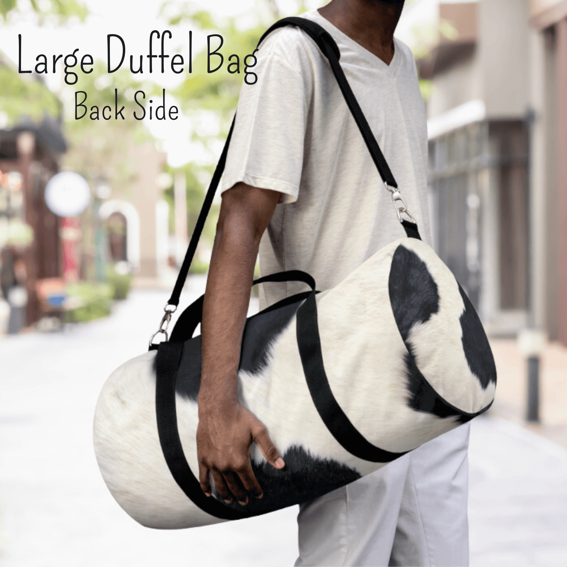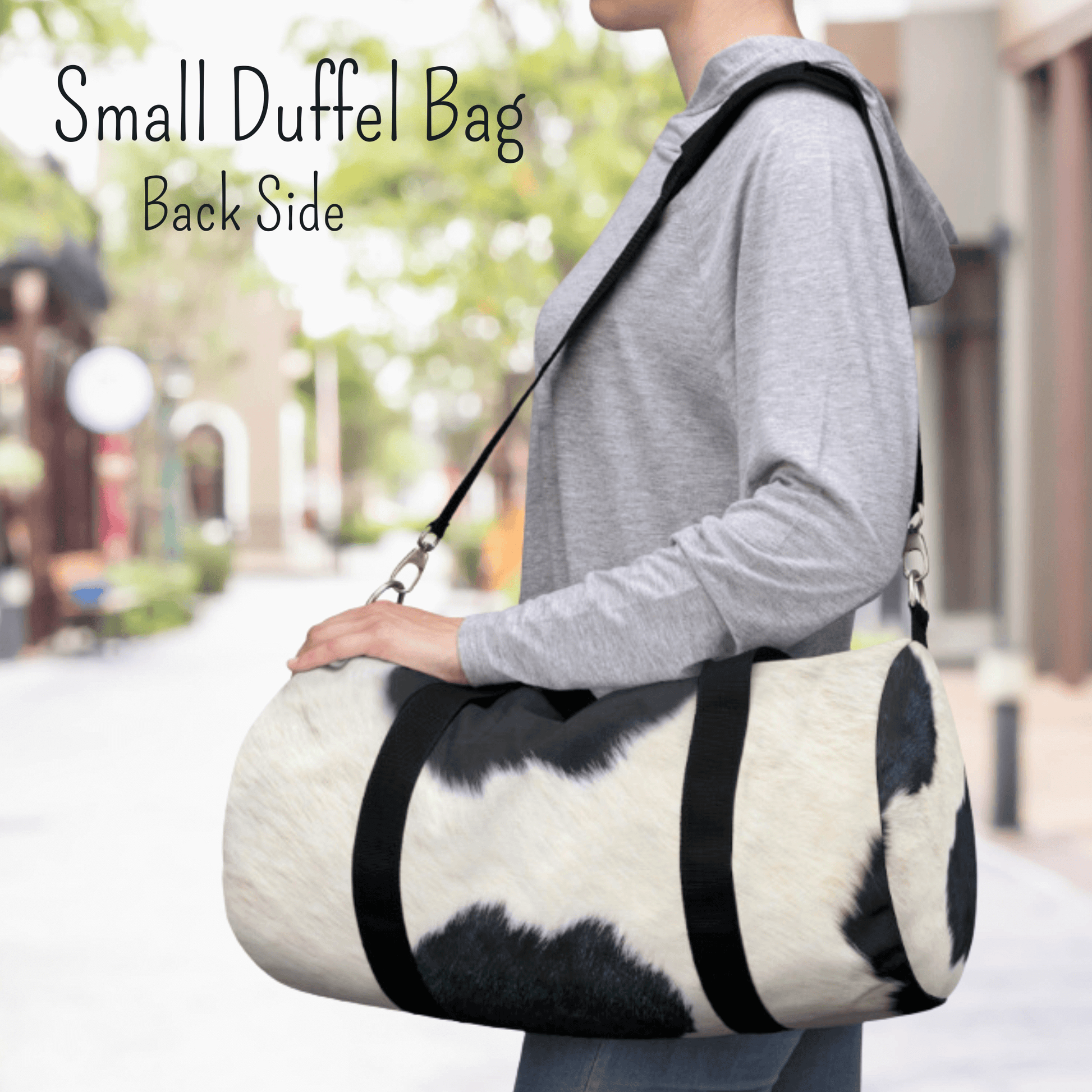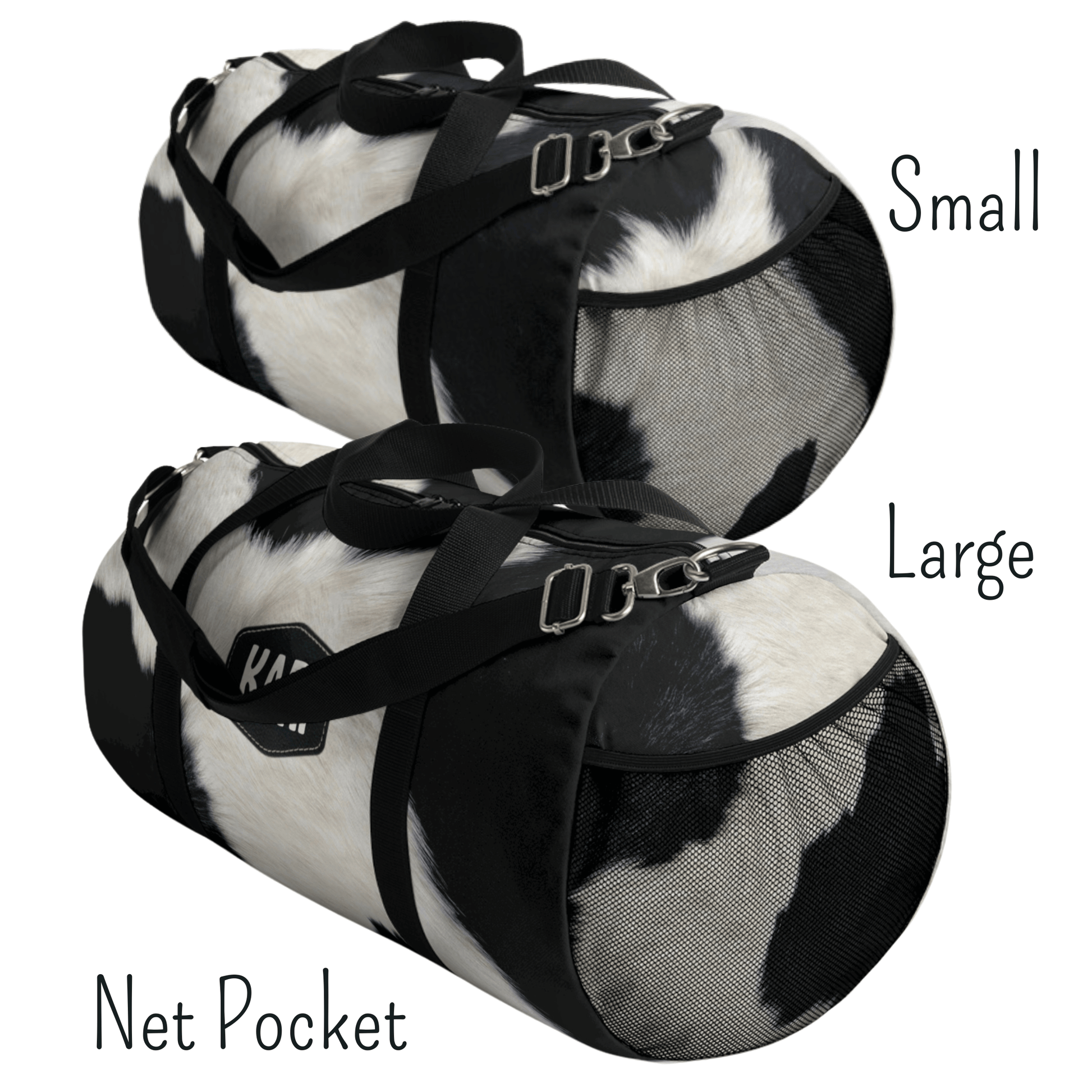 The perfect cowhide print gym bag for girls doubles as a custom sports bag for school or a monogram cow print weekender bag.