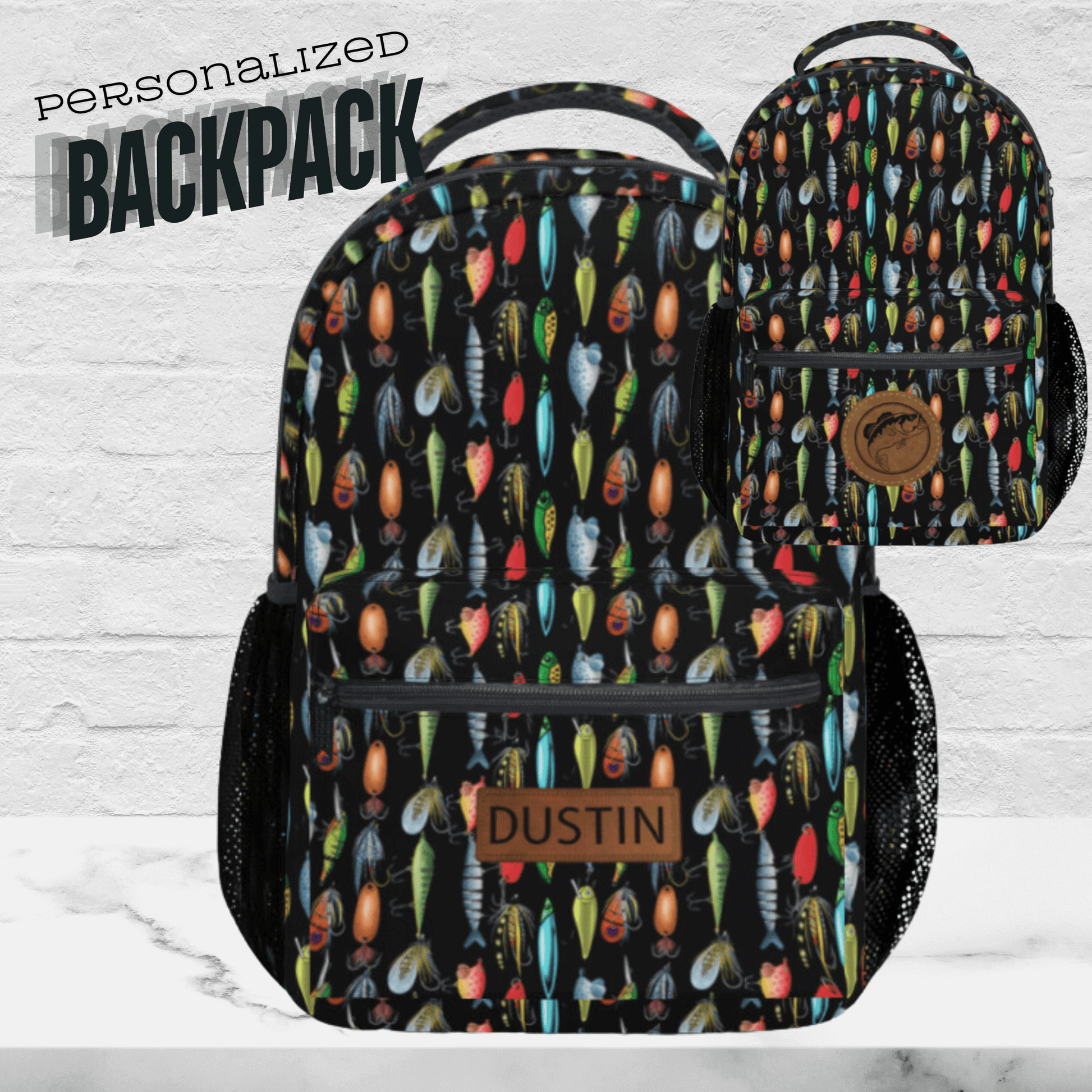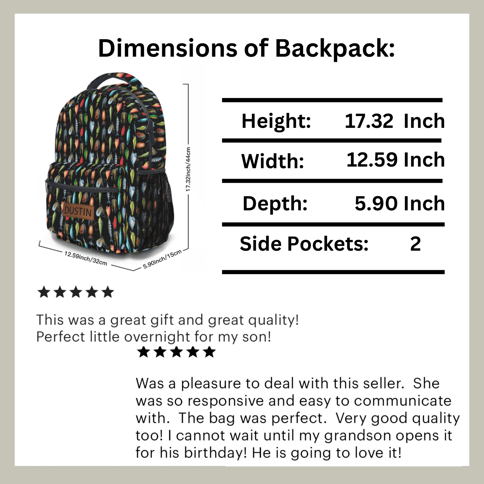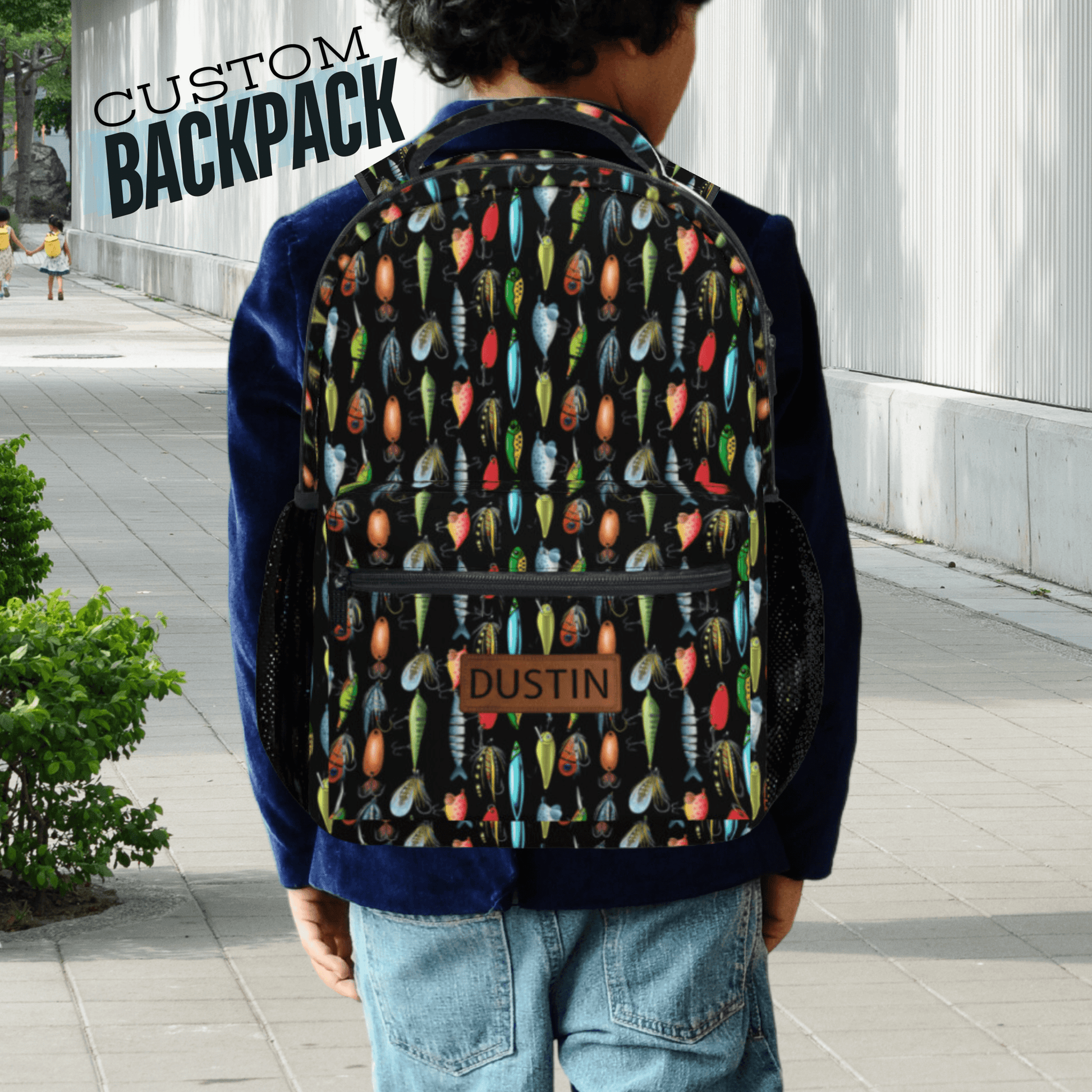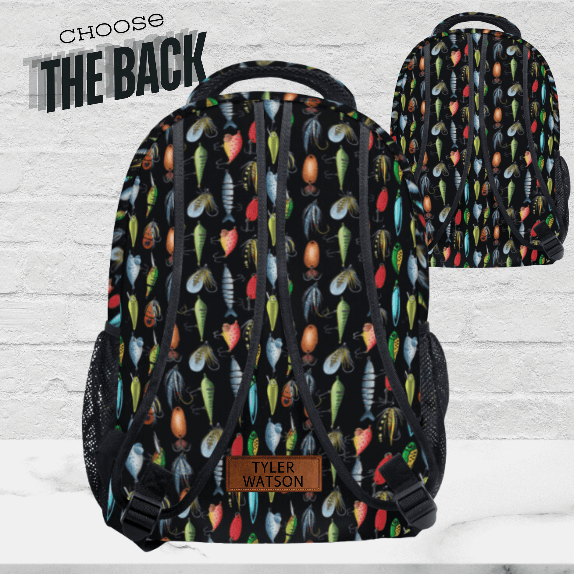 Our personalized backpack for boys who love to fish has a fishing lure design. Customize the front and back of this school bag. This one-of-a-kind design backpack doubles as a travel bag for kids or a laptop bag for college fishing enthusiasts.
