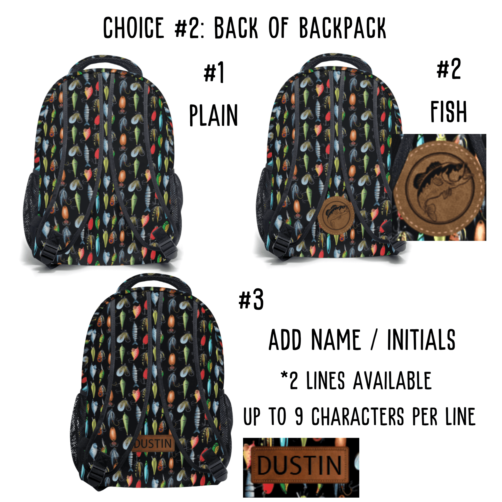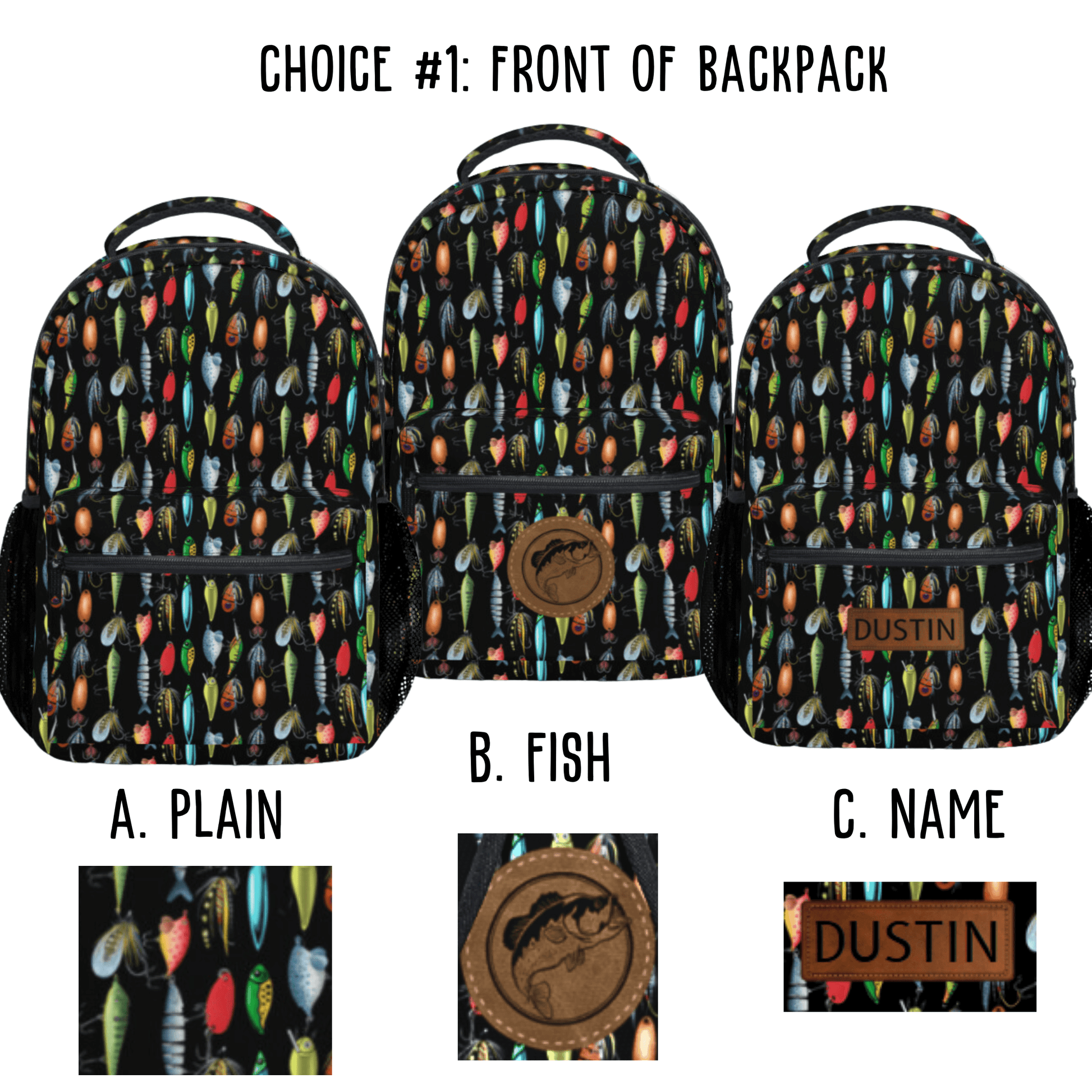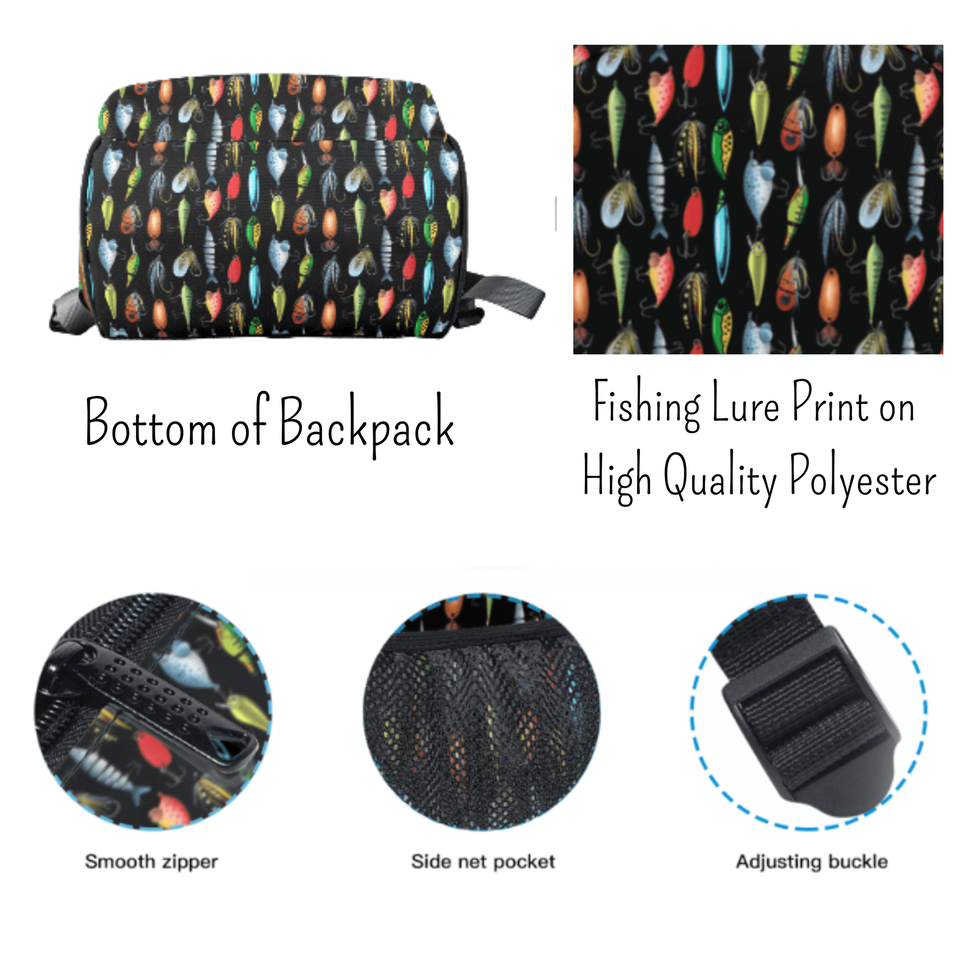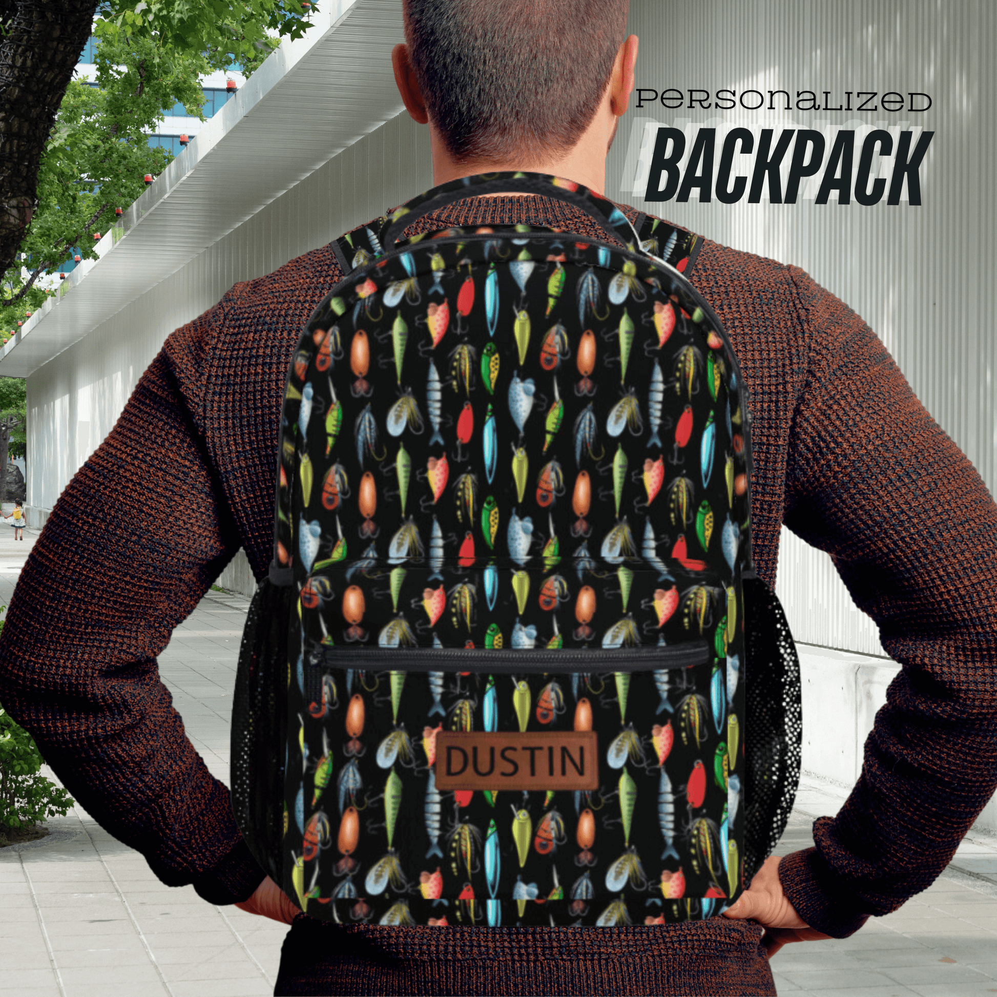 Our personalized backpack for boys who love to fish has a fishing lure design. Customize the front and back of this school bag. This one-of-a-kind design backpack doubles as a travel bag for kids or a laptop bag for college fishing enthusiasts.