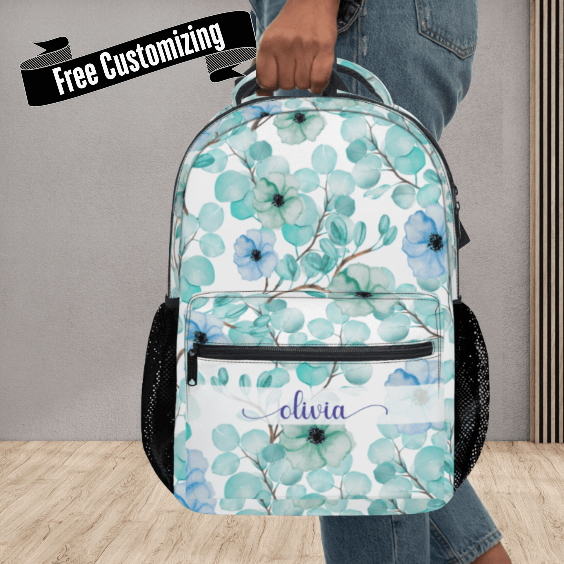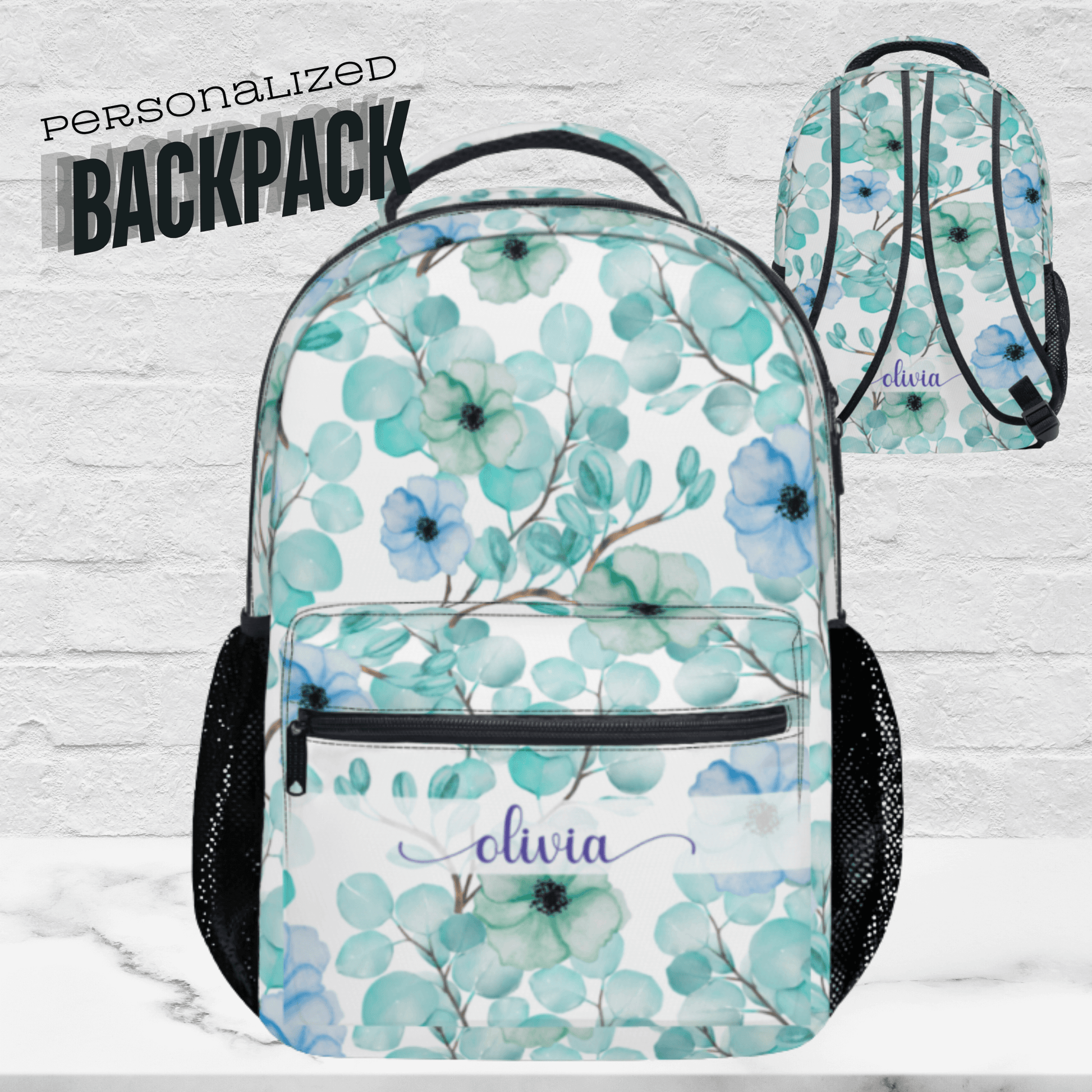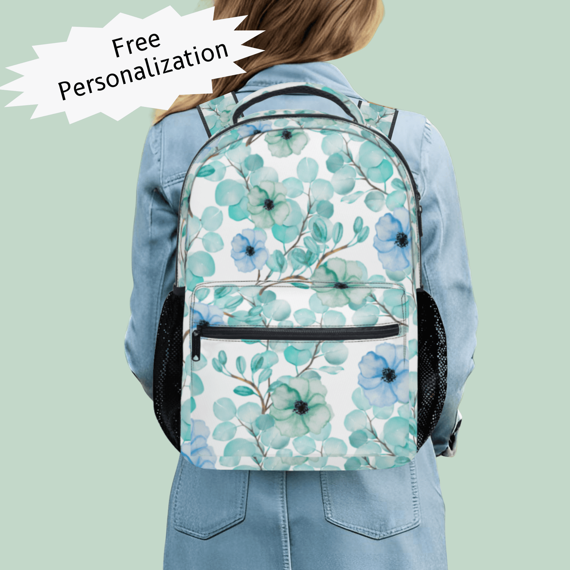 This blue and green flower school bag can be personalized with your name and makes a unique back to school book bag or airplane carryon, keeping essentials organized in a feminine design.