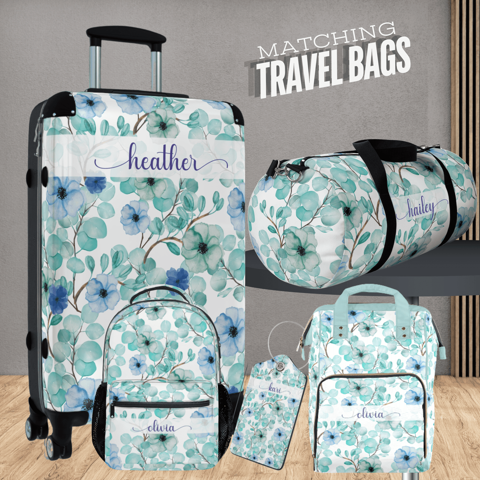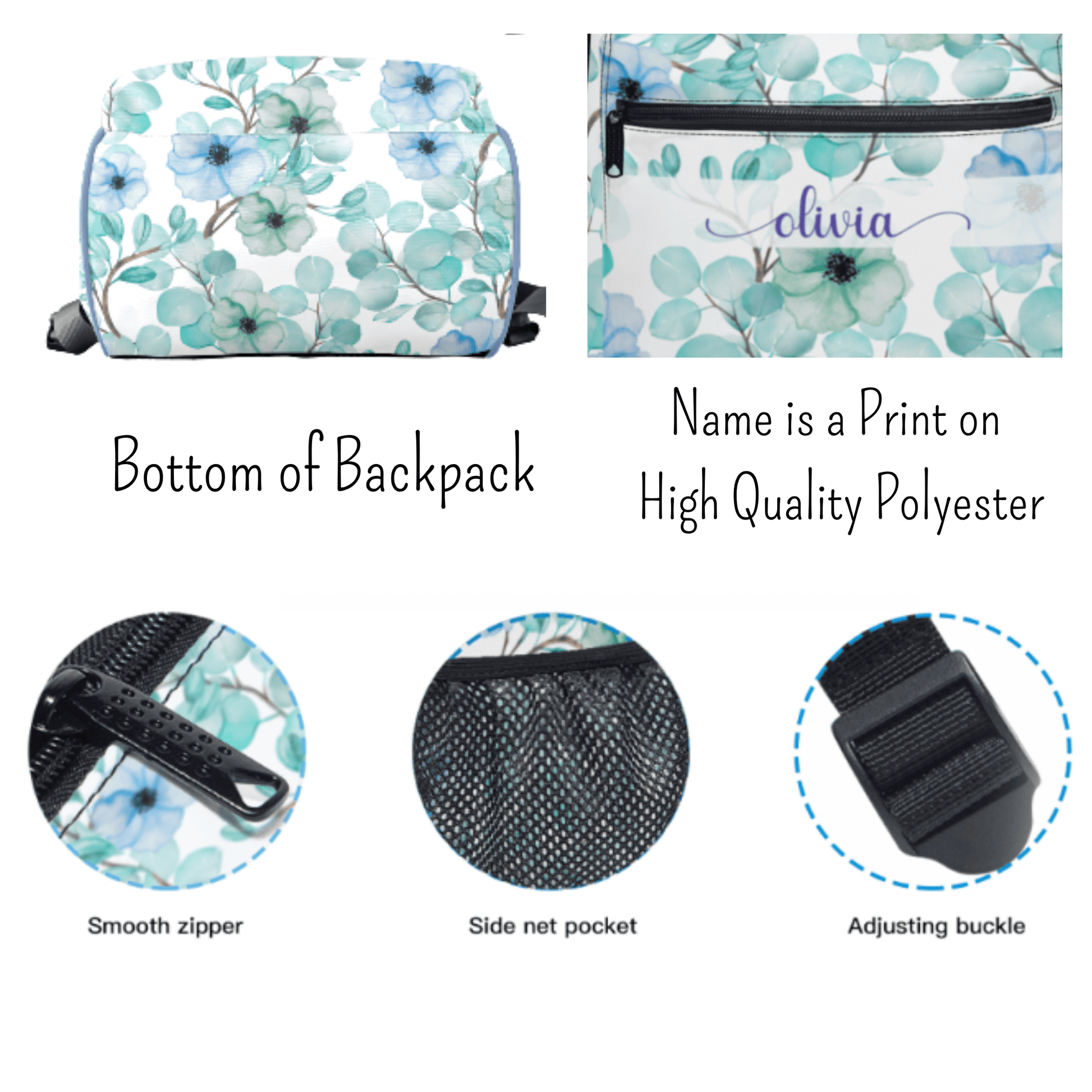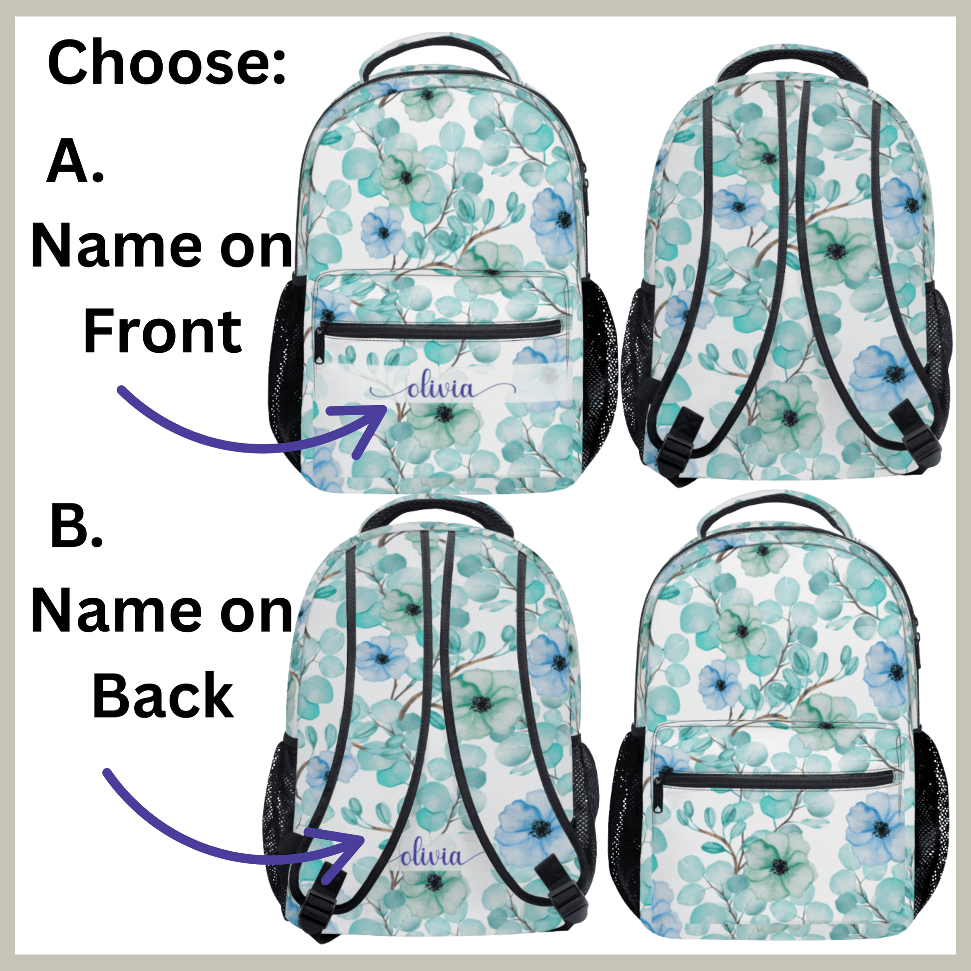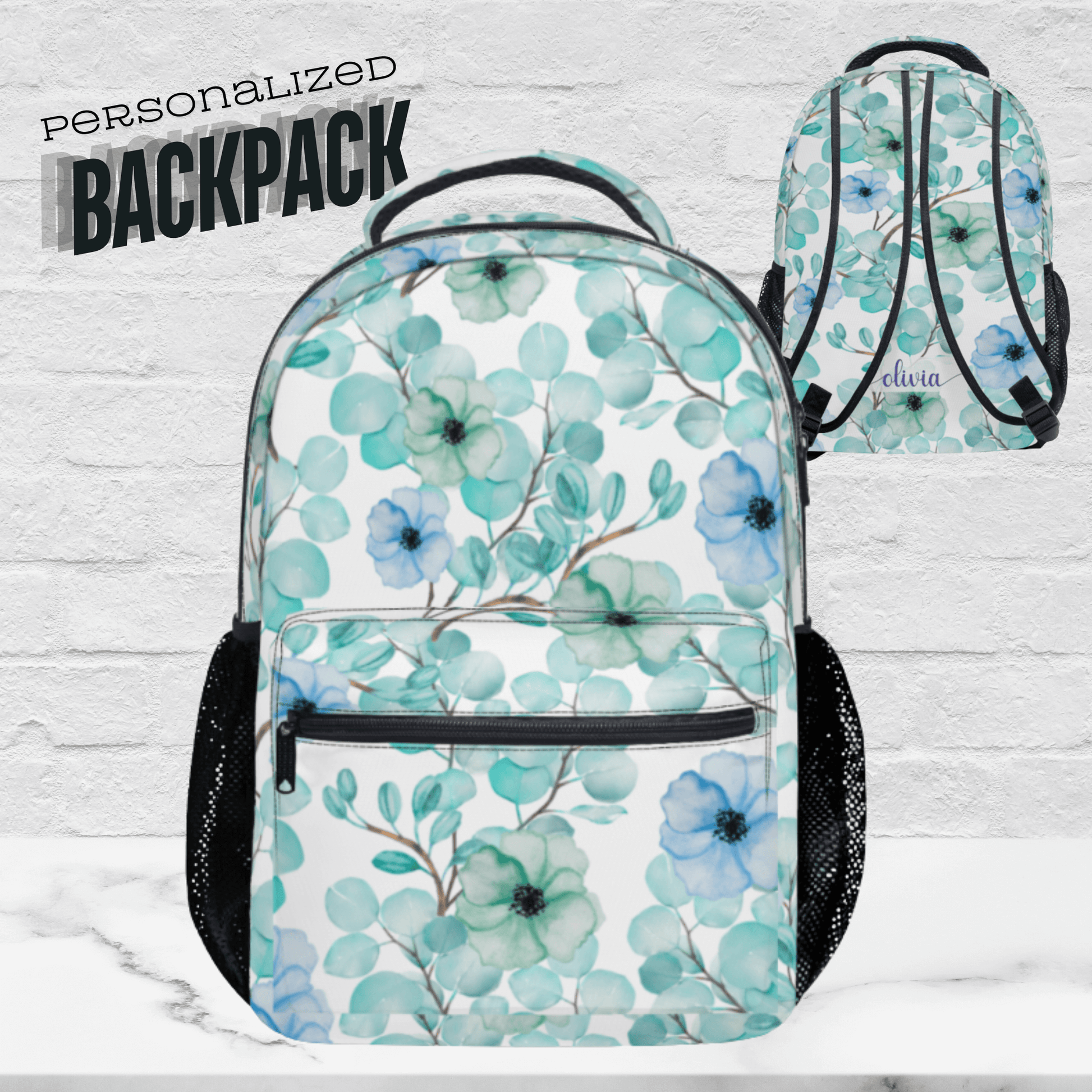 This blue and green flower school bag can be personalized with your name and makes a unique back to school book bag or airplane carryon, keeping essentials organized in a feminine design.