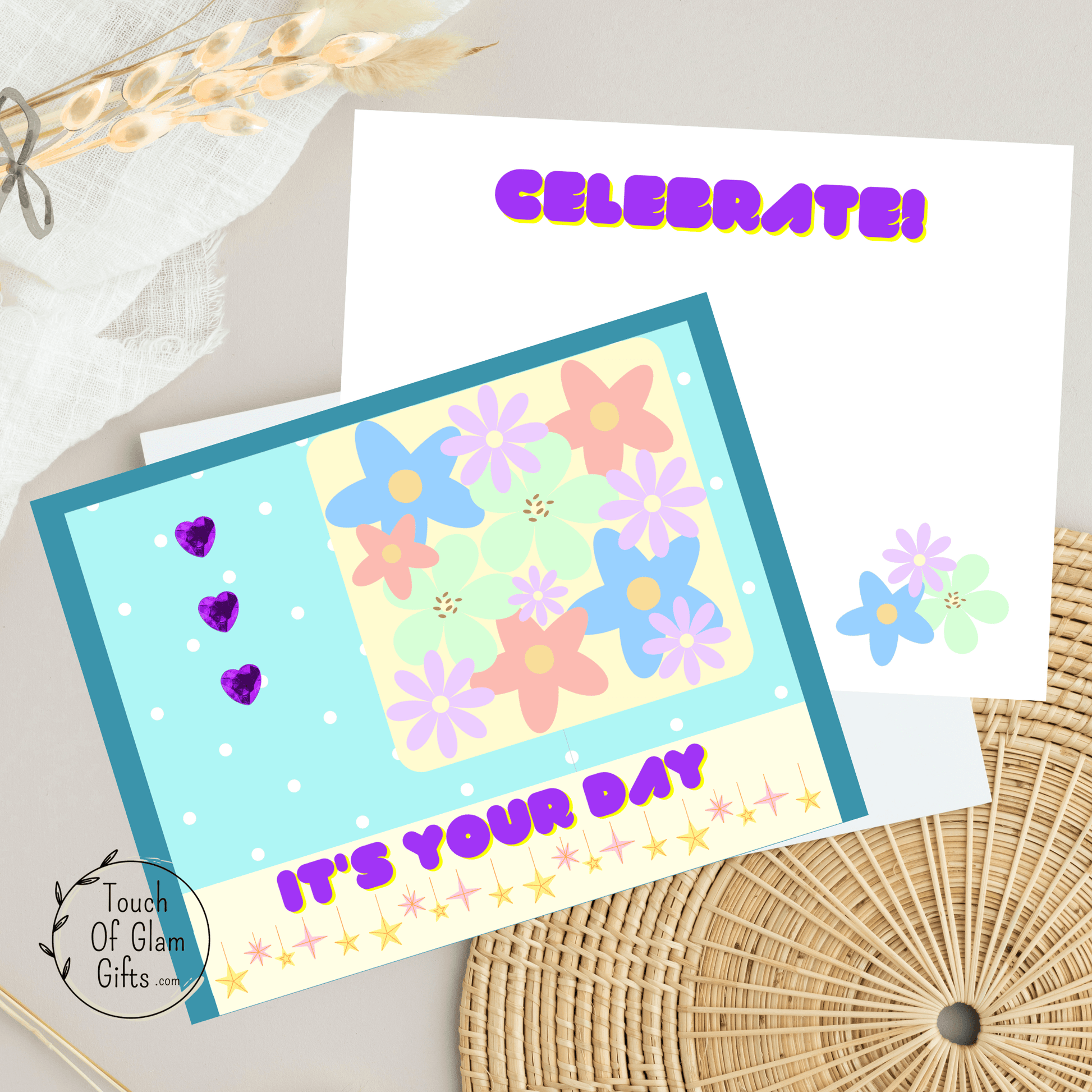 This "It's Your Day.. Celebrate" card has a classic charm making it a memorable and unique choice for celebrating your special someone's special day.