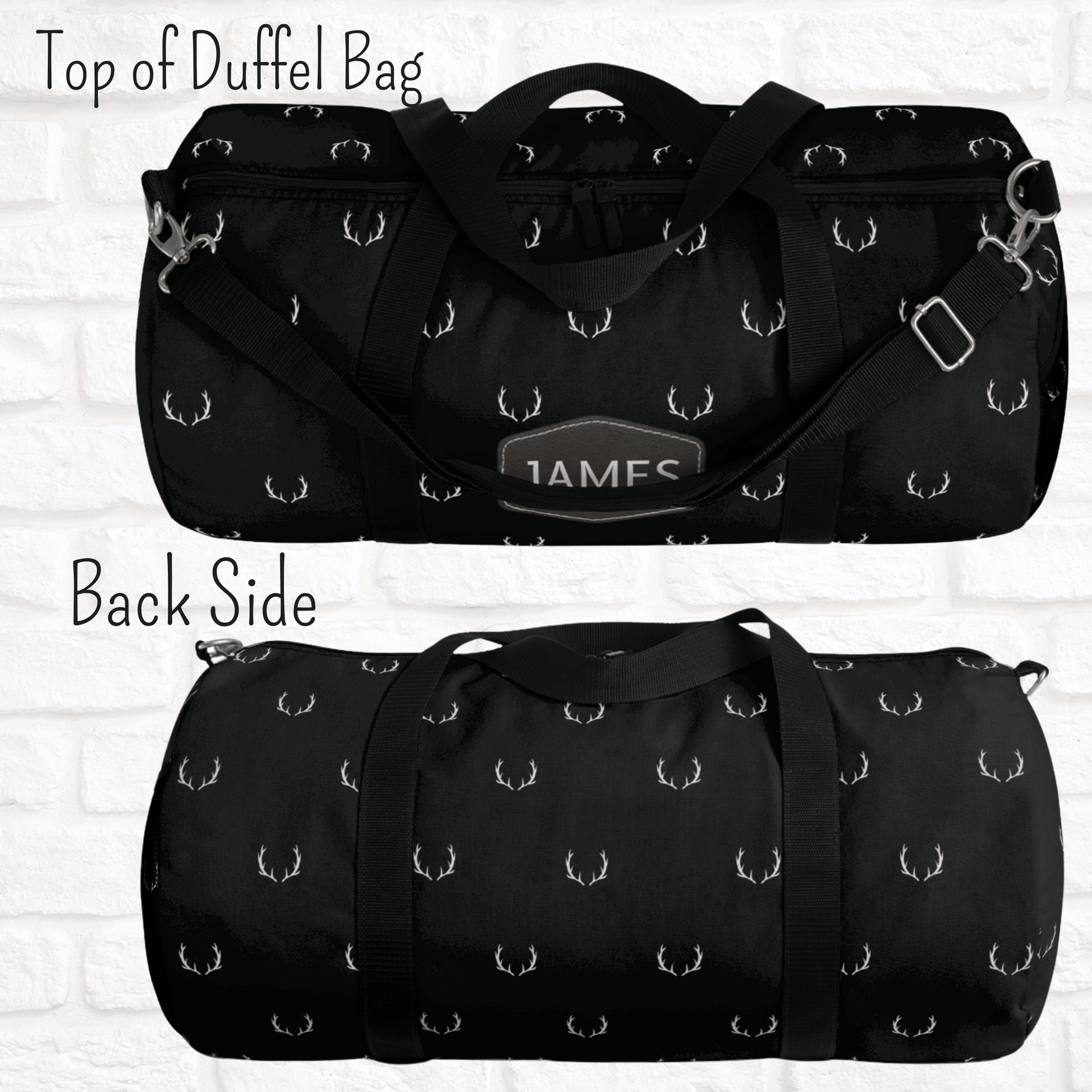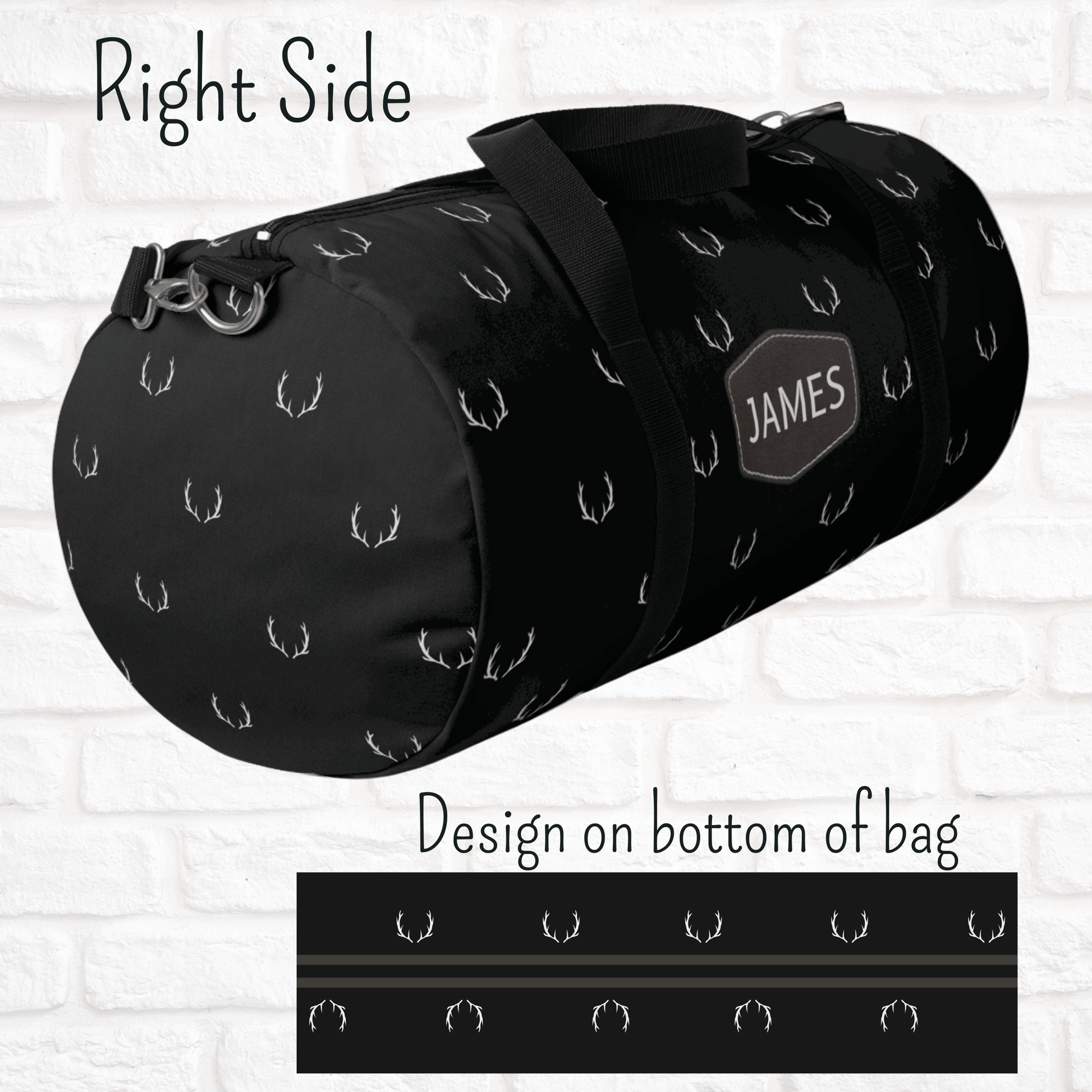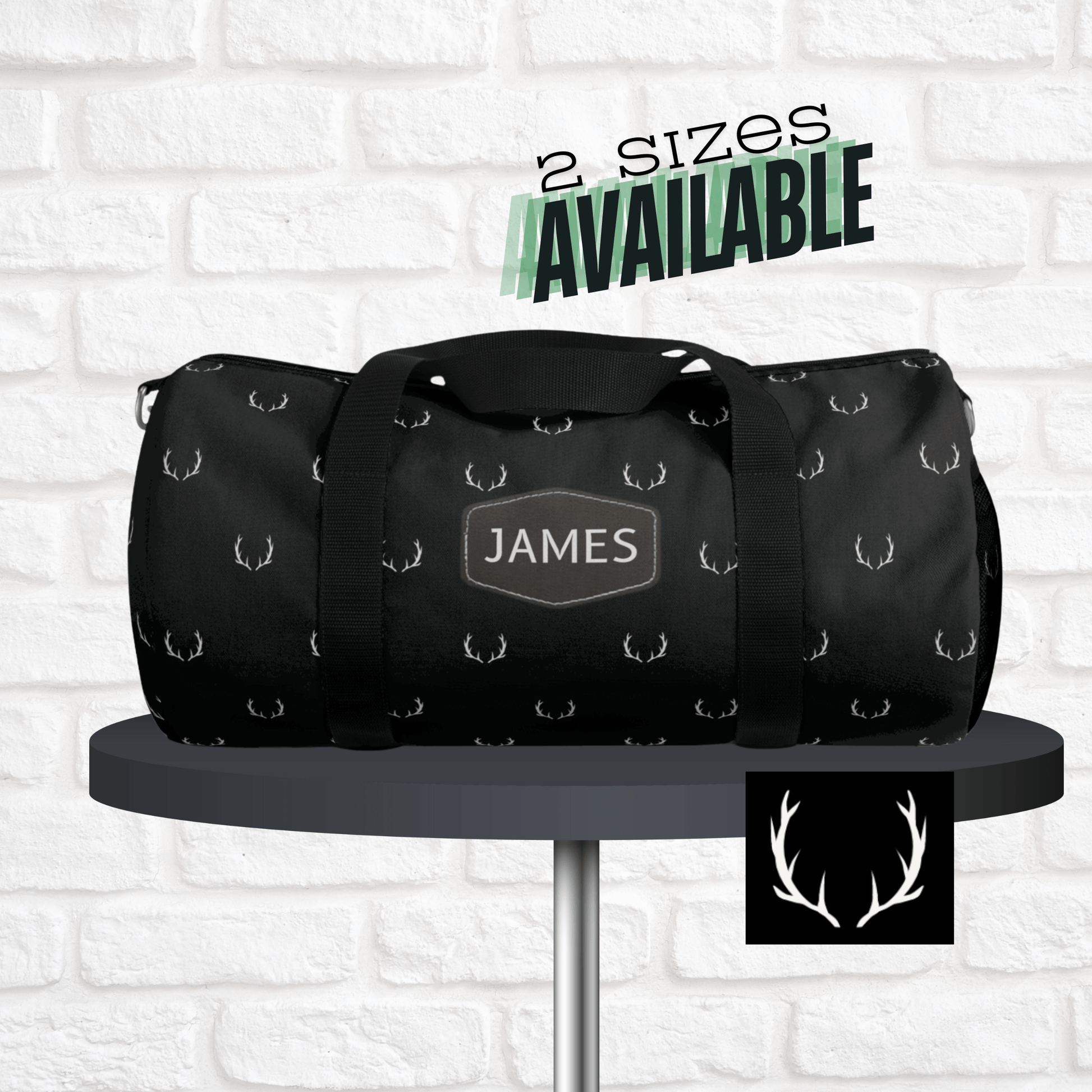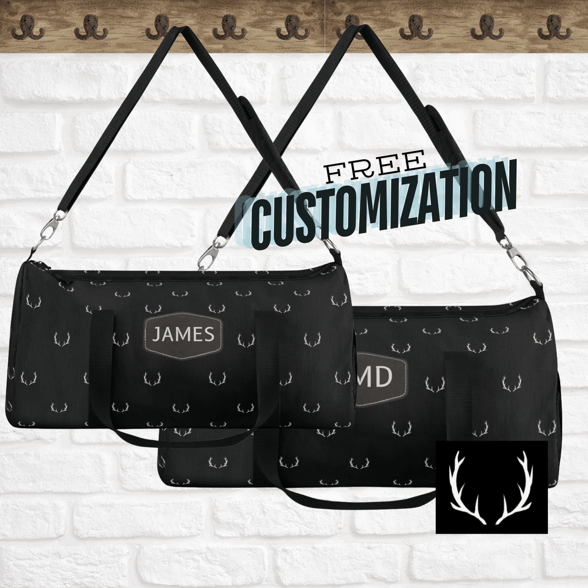 Our weekender bag for men is the perfect gift for deer hunters. Our personalized duffel bag with deer antler design comes in large & small size.