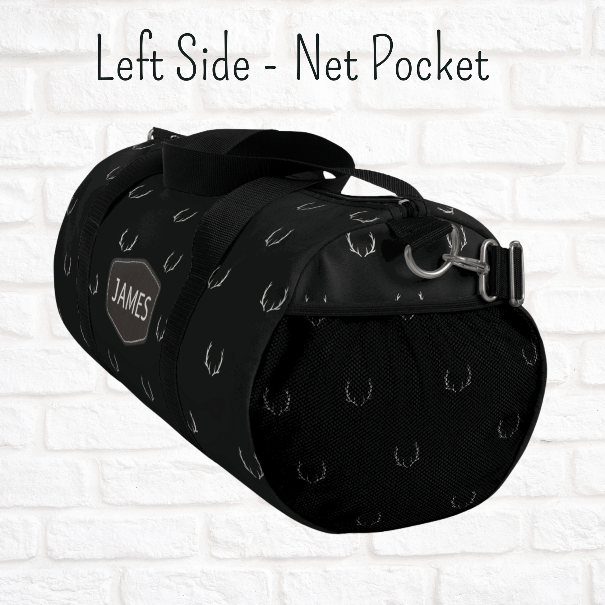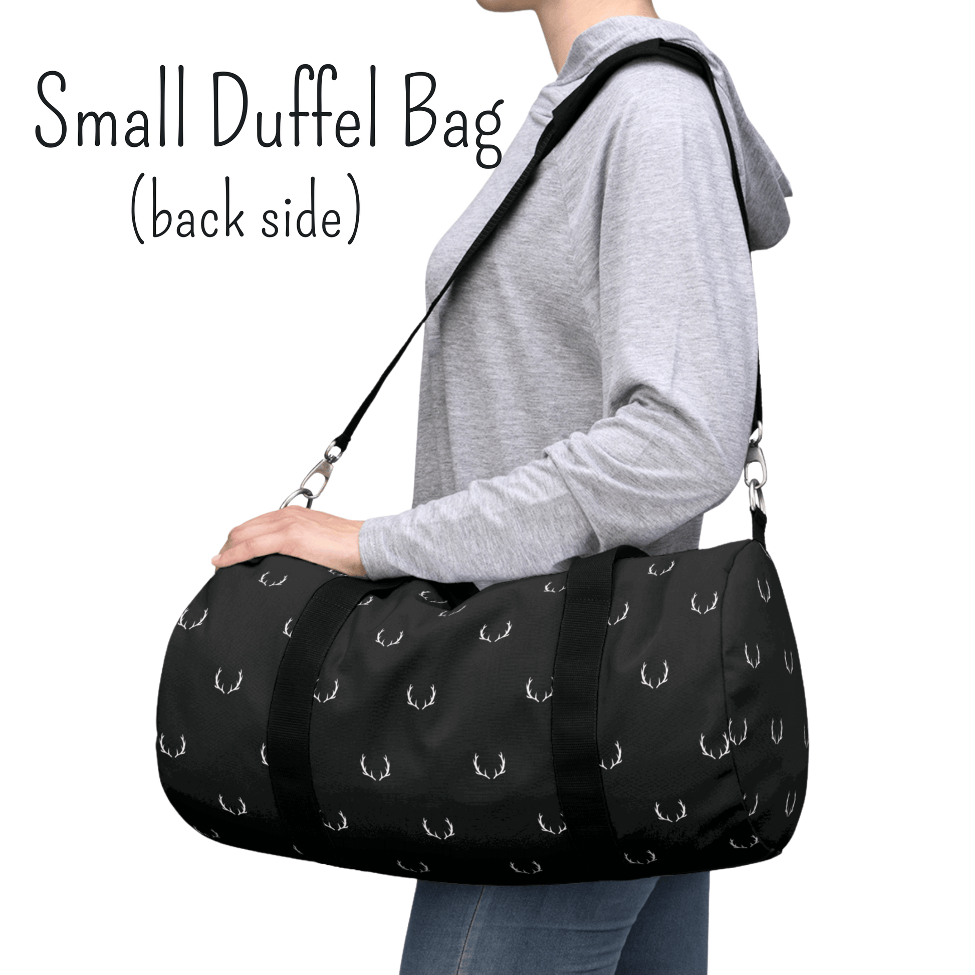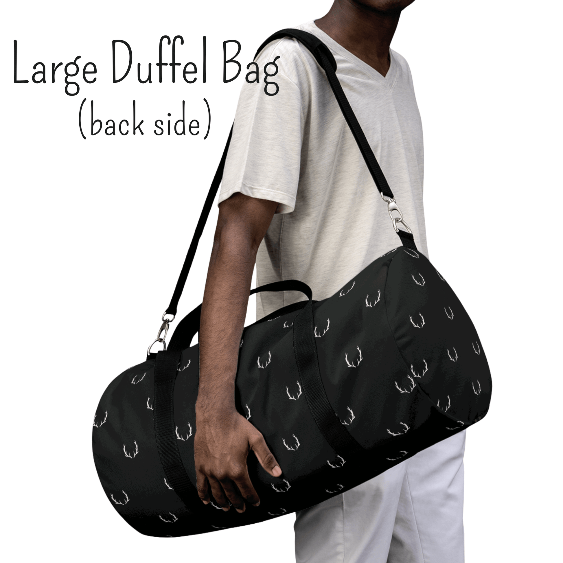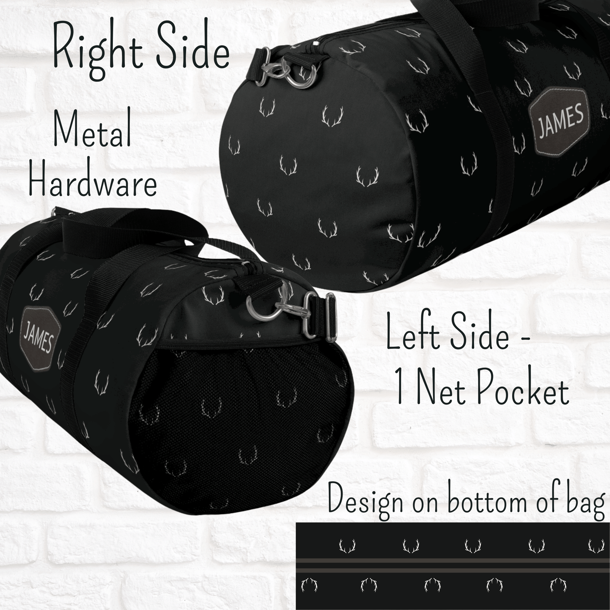 Our weekender bag for men is the perfect gift for deer hunters. Our personalized duffel bag with deer antler design comes in large & small size.