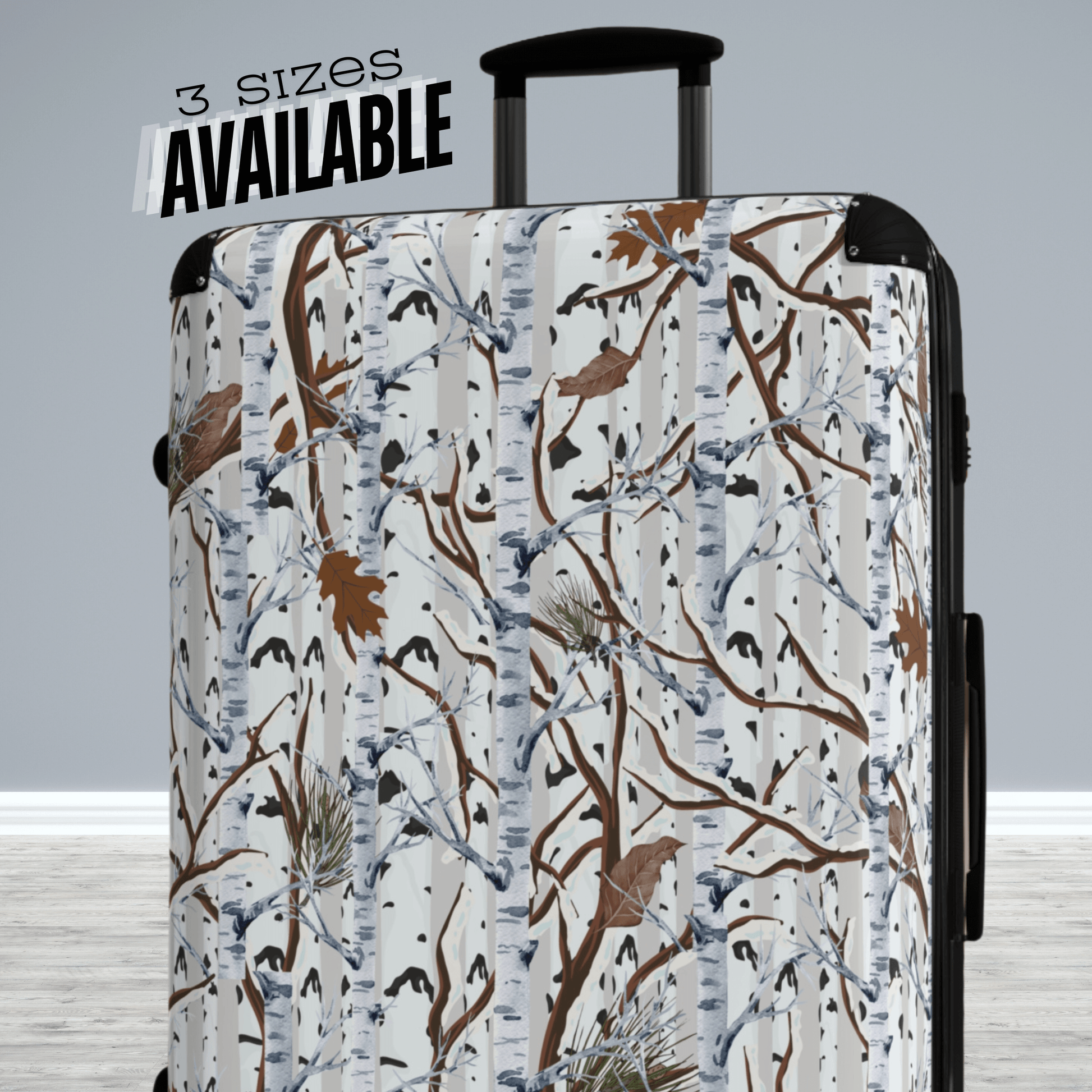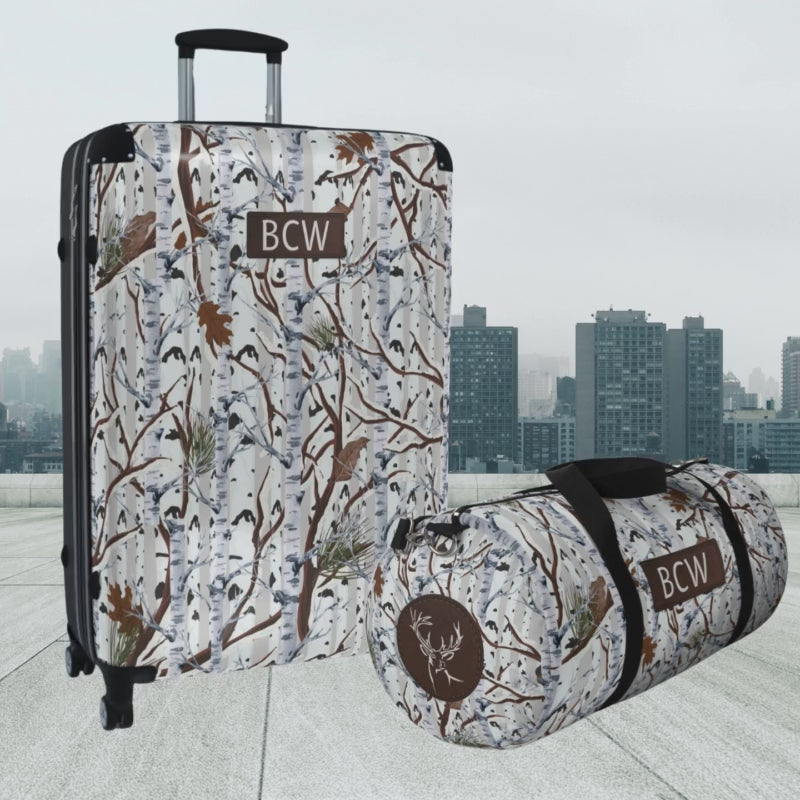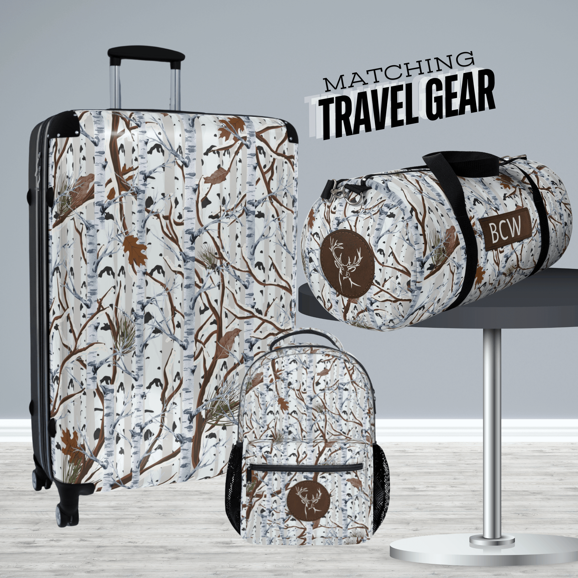 Our white camouflage luggage for men offers a stylish option for those seeking a Winter tree camo spinner suitcase. This personalized carry on bag & travel gear makes a great gift idea for hunter husbands, boyfriends and sons. A custom white camo travel bag for men and boys is a unique & practical gift they'llย use for years.