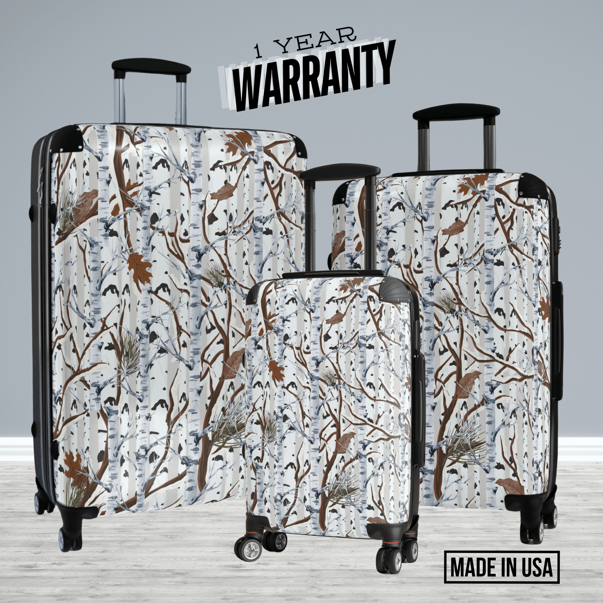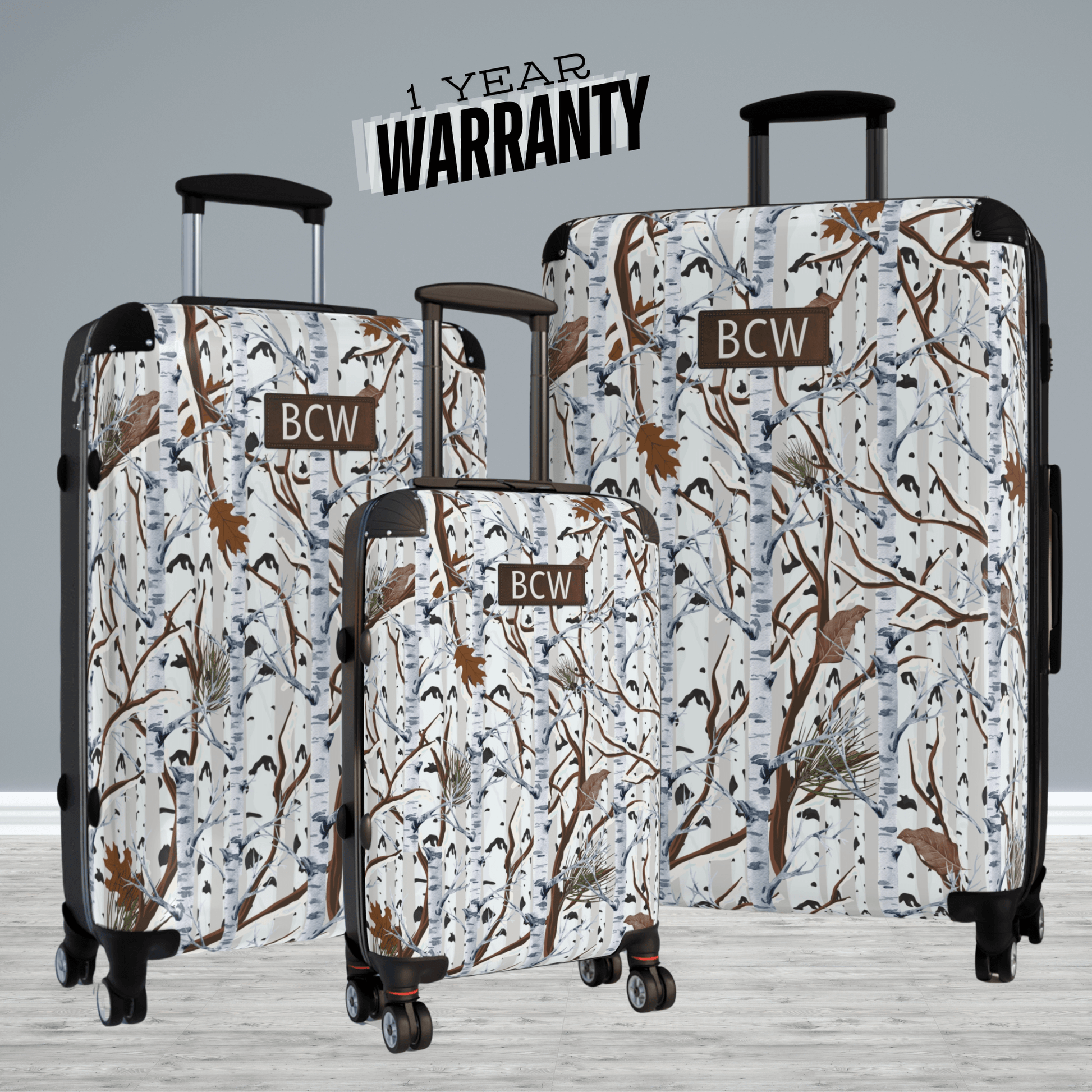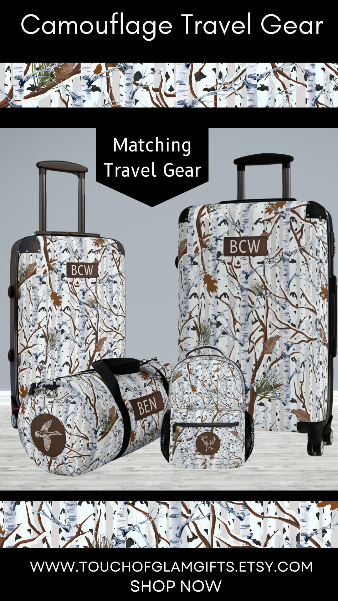 Our white camouflage luggage for men offers a stylish option for those seeking a Winter tree camo spinner suitcase. This personalized carry on bag & travel gear makes a great gift idea for hunter husbands, boyfriends and sons. A custom white camo travel bag for men and boys is a unique & practical gift they'llย use for years.