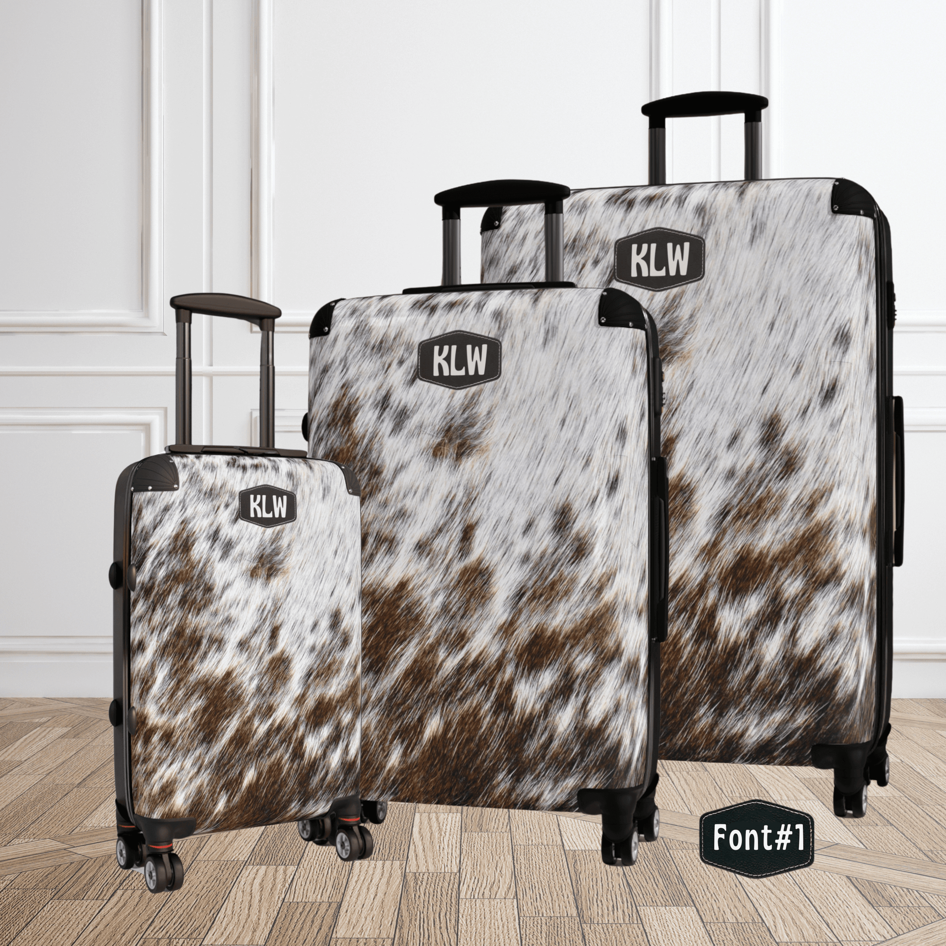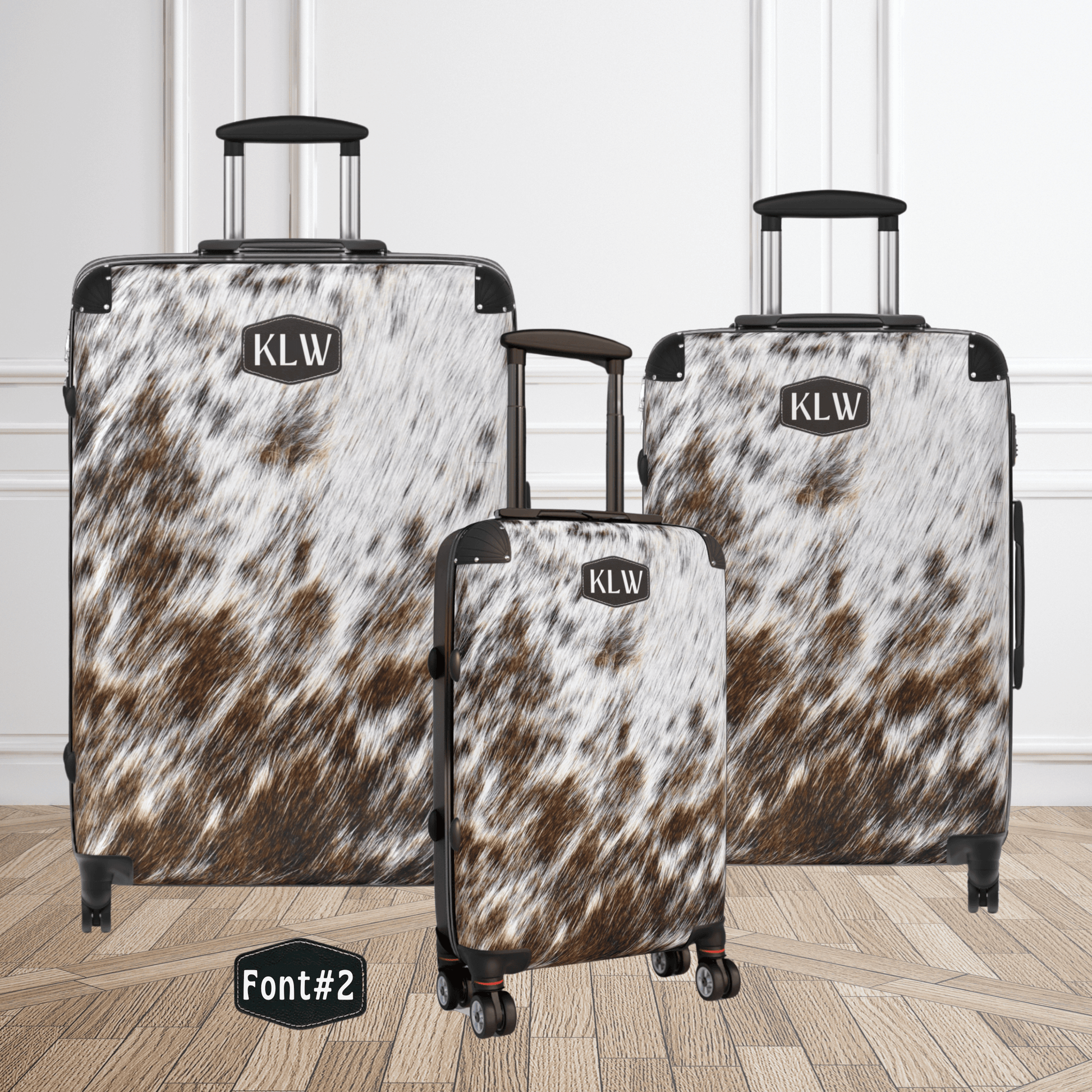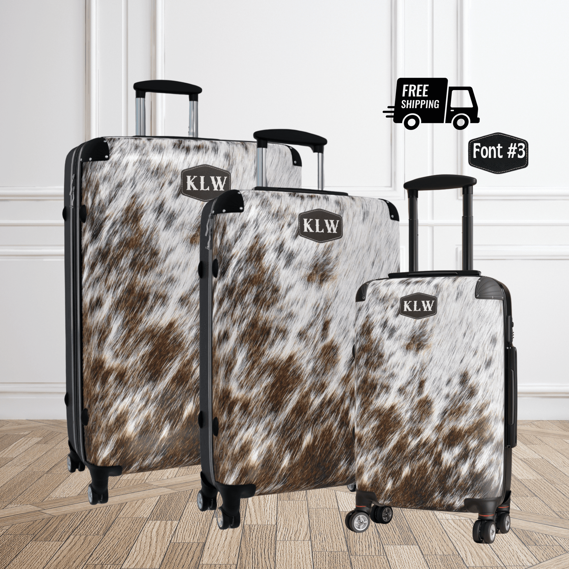 Our womens luggage set personalized with monogrammed initials, stands out from the crowd in a sea of boring suitcases. With their eye-catching cowhide print design, women can travel with our western style suitcase and not worry about losing thier suitcase on the carousel again.
